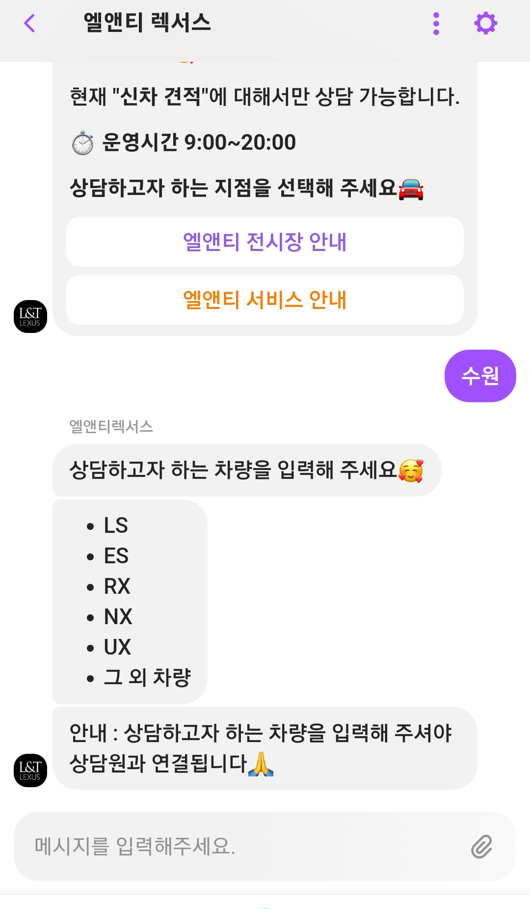 렉서스 공식 홈페이지와 SNS 채널을 통해 이 소식을 접한 덕에, 이번 3월 시승 이벤트에도 참여해 보기로 결정! 집에서 가까운 곳에서 시승을 진행하기 위해 렉서스 공식 딜러 '엘앤티렉서스' 수원 전시장에 간편하게, 채널톡 서비스를 통해 차량 문의와 시승 예약을 진행했다. PC뿐만 아니라 모바일에서도 간편하게 이용할 수 있는 엘앤티렉서스의 채널톡 서비스, 원하는 전시장과 상담 희망 차량을 선택하면 빠른 시간 내 담당 SC를 배정해 차량 정보 및 현재 진행 중인 프로모션 내용과 함께 시승 예약까지 한 번에 간편하게 이용할 수 있다.
