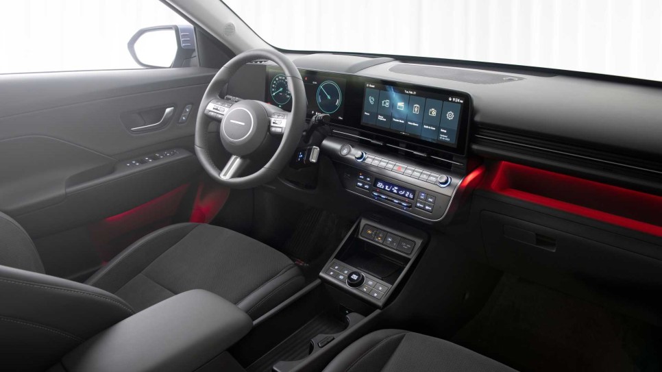 실내도 디 올 뉴 코나 가솔린 모델과 동일한 구조에 12.3인치 디지털 클러스터와 12.3인치 센터 스크린으로 구성한 파노라믹 디스플레이가 적용되며, 차세대 인포테인먼트 시스템인 ccNC와 무선 소프트웨어 업데이트, 전기차 특화 콘텐츠, 실물 카드 없이 등록된 정보로 카페이와 연동해 사용 가능한 e 하이패스, 빌트인 캠 2, 디지털 키 2, 애프터 블로워, 실내 V2L, 헤드업 디스플레이 등이 편의 사양으로 적용된다.
