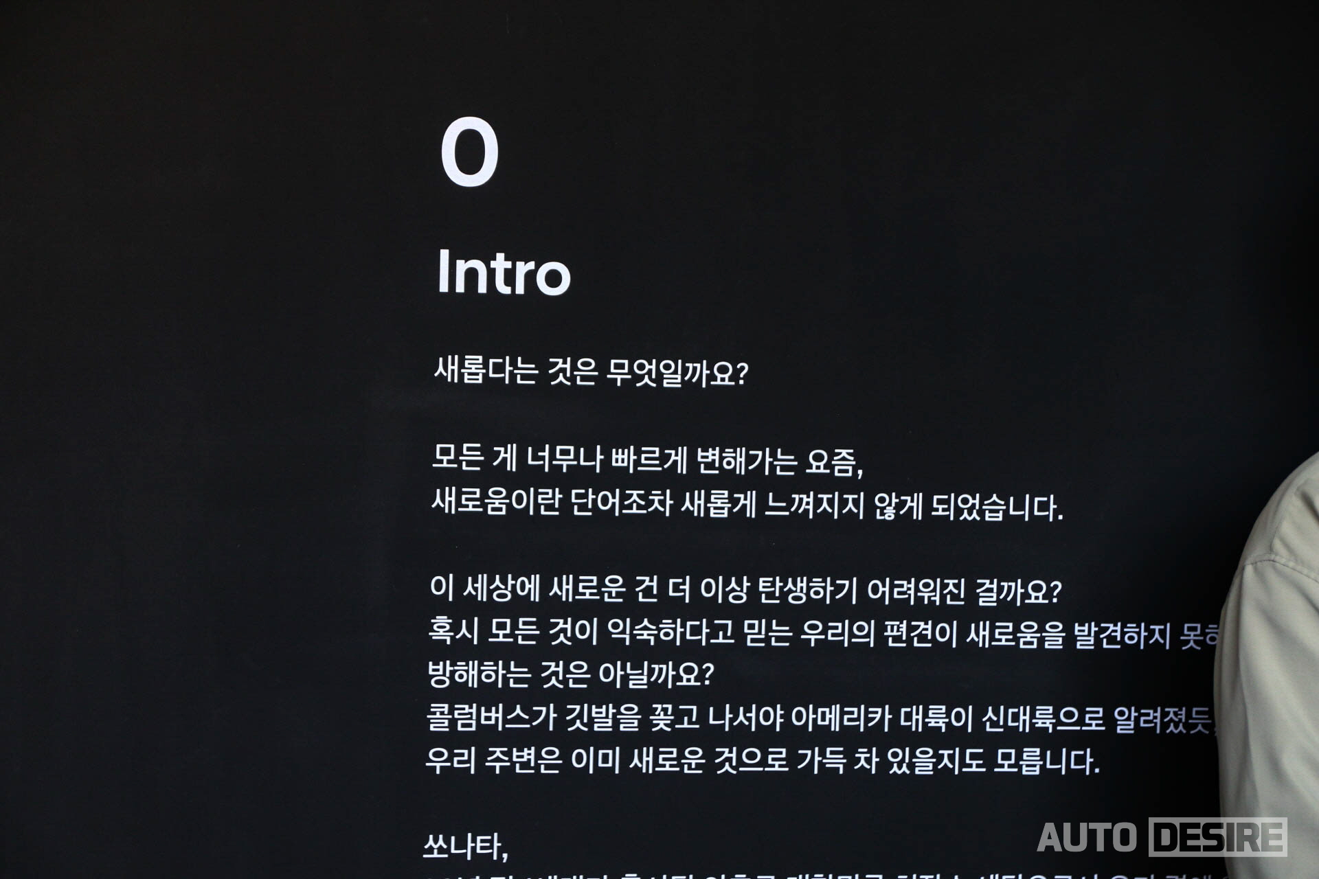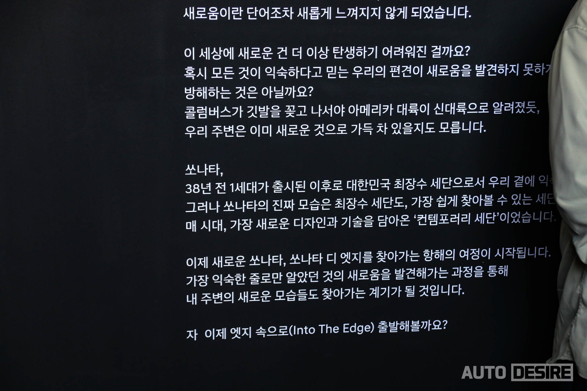 인투 디 엣지 입장에 앞서 인트로를 통해 새로운 쏘나타와 전시 공간에 소개 글을 통해 8세대를 거쳐 현재 쏘나타 디 엣지가 고객들에게 전달하고자 하는 새로움, 또 주변에서 익숙하게 봐왔던 것에서 발견하는 새로움에 대한 메시지를 전하고 있었다. 오랜 시간 국내 시장에서 가장 대표적인 중형 세단, 패밀리 세단으로서 고객들과 함께 해온 쏘나타이지만 최근에는 SUV 시장을 비롯해 위/아래급 모델들의 강세 속에 그 위상이 다소 누그러진 상태인데, 쏘나타의 결코 가볍지 않은 존재감을 다시 상기시키는 것과 함께, 고객들이 쏘나타를 새로운 시각으로 바라볼 수 있도록 과감한 시도를 적용한 듯하다.