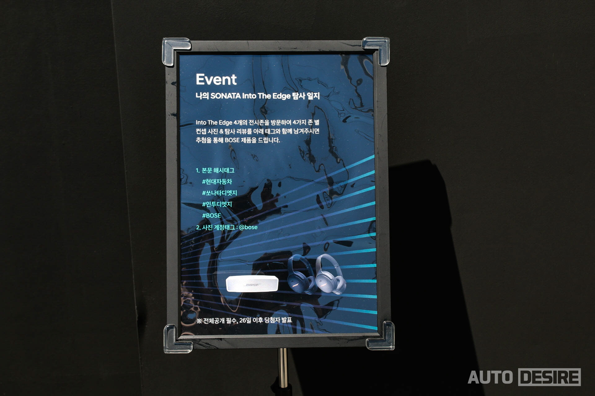 이번 전시 기간 동안 쏘나타 인투 디 엣지를 방문하고 SNS에 필수 태그와 함께 방문 기록 업로드를 하는 고객들에게는 BOSE에서 제공하는 블루투스 스피커와 헤드셋을 제공하는 이벤트도 함께 진행되었다.
