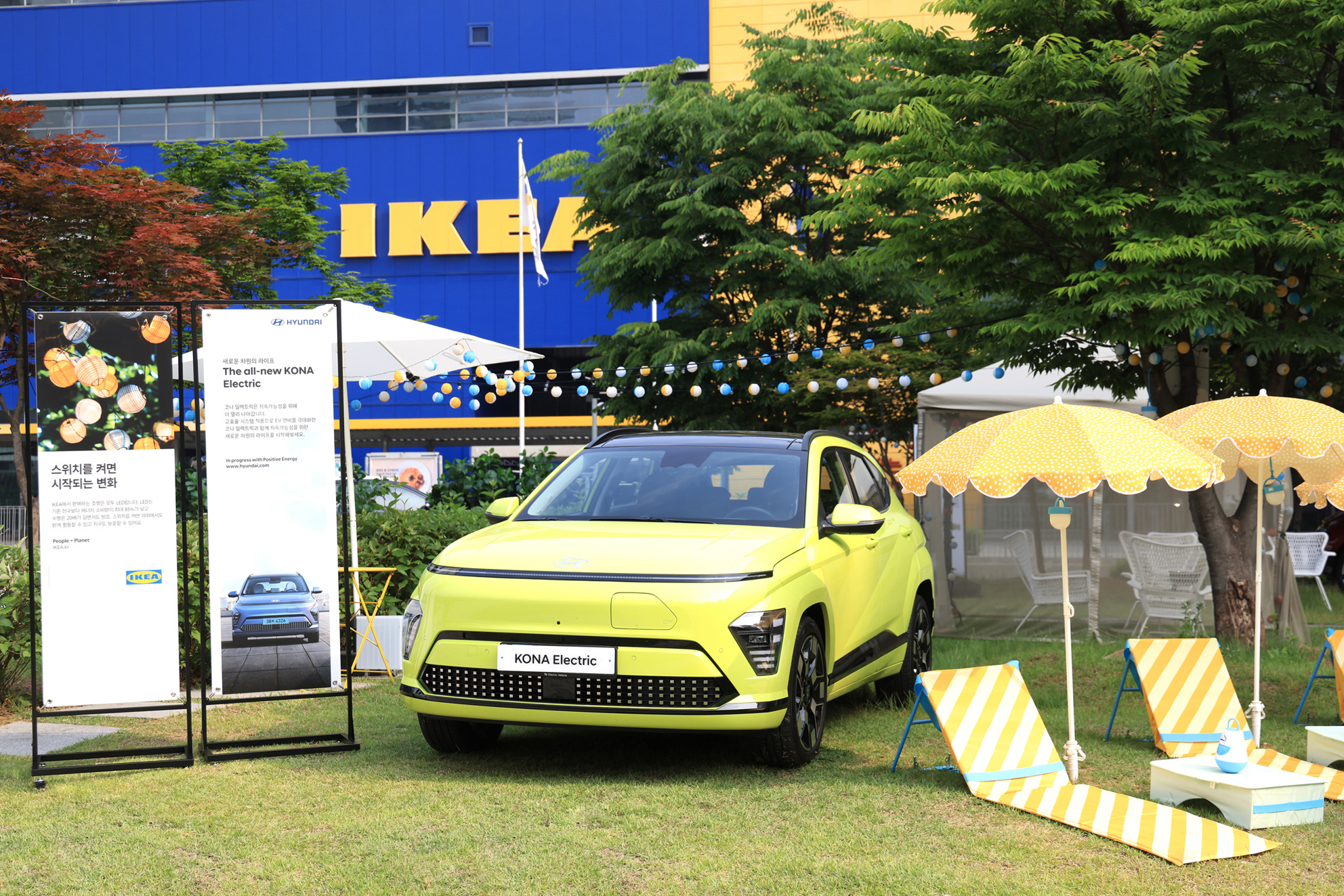 먼저 '코나 EV 존'은 SUV 전기차와 함께 떠나는 해변 피크닉을 주제로 하며, 고효율 시스템을 적용해 전비를 극대화한 디 올 뉴 코나 일렉트릭 전시 차량과 함께 이케아의 접이식 아웃도어 용품을 함께 배치, 지속 가능한 아웃도어 라이프 스타일을 제시한다. '아이오닉 6 존'은 어디서나 편안한 업무와 휴식을 즐길 수 있는 나만의 공간, 워케이션 콘셉트를 표현했으며 이케아의 다양한 소재와 스타일을 적용한 야외용품을 아이오닉 6의 V2L 기능과 함께 활용할 수 있는 방법을 제안한다.