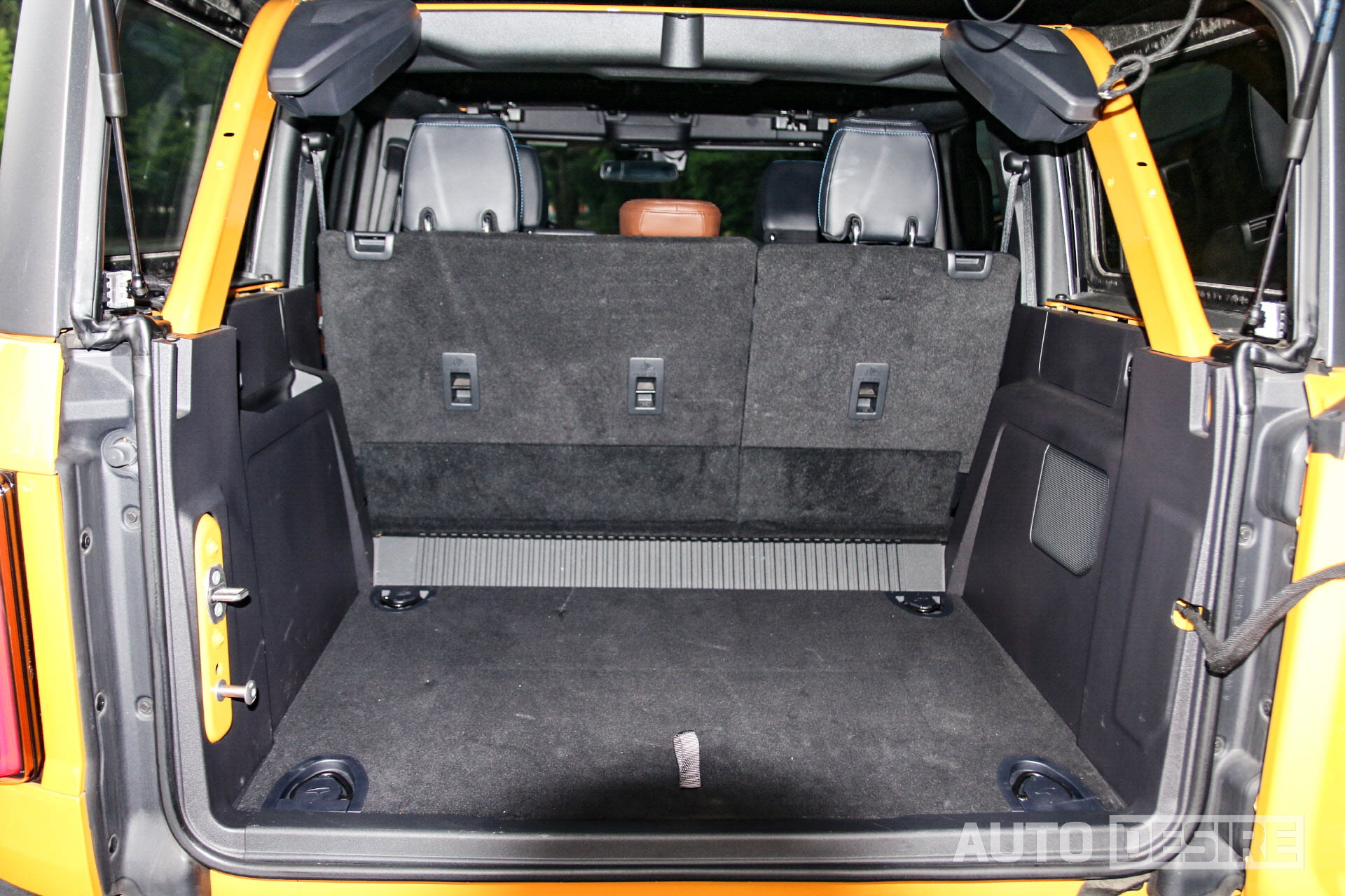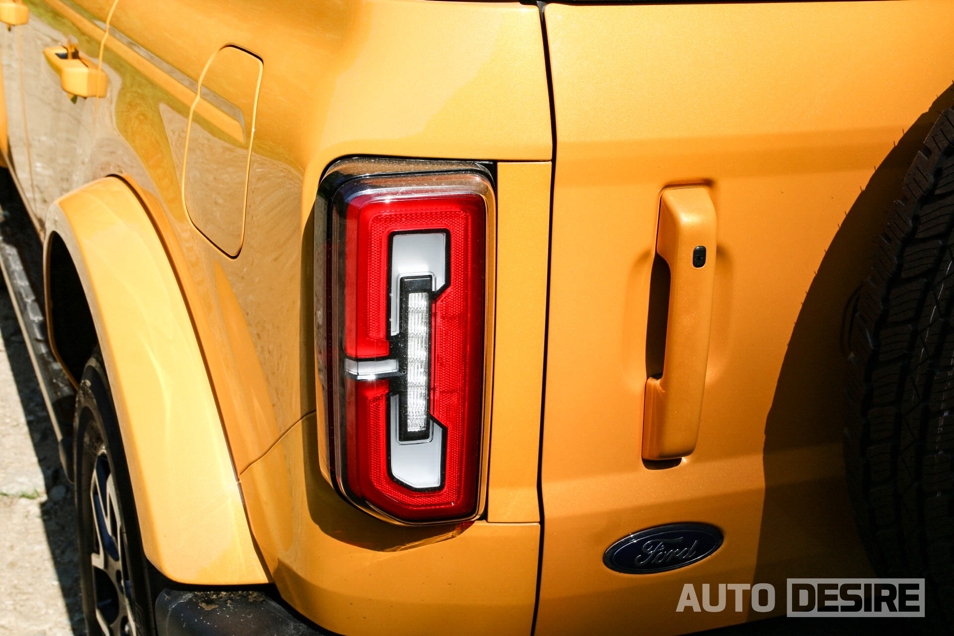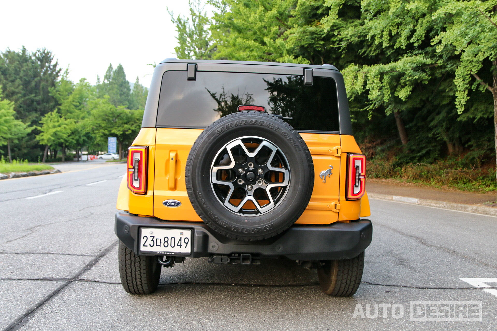 후면에서도 상단 탑부분의 리어 글라스와 하단 차체의 도어가 따로 열리는 테일게이트, 큼지막하게 달려 있는 스페어 타이어, 드러나 있는 경첩 등 투박, 터프한 오프로드 SUV의 특징이 살아있으면서도 수직형의 LED 리어콤비네이션 램프의 그래픽에서는 화려하고 모던한 감각이 느껴지기도 한다. 테일게이트 오른쪽에는 브롱코 야생마 엠블럼이, 왼쪽의 도어 캐치 하단에는 포드 엠블럼이 부착되어 있는데, 이게 외관에서 유일한 포드 타원형 엠블럼. 보트 트레일러, 카라반 등 장착을 고려해서 트레일러 히치도 기본 장착되어 있고 뒤 번호판은 간섭을 피하고 확실한 식별이 가능하게 왼쪽으로 치우쳐져 있다.