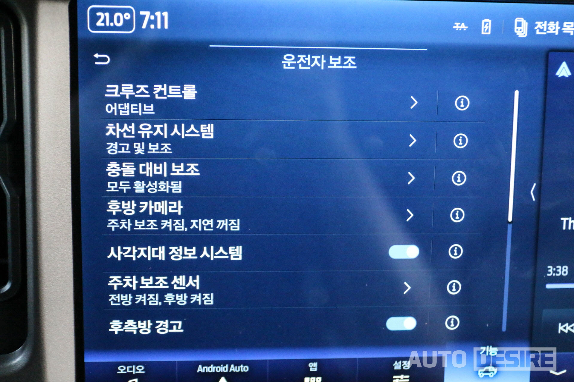 안전 사양과 주행 보조 시스템에 있어서도 어댑티브 크루즈 컨트롤과 차선 유지 경고 및 보조 시스템, 후방 카메라와 360도 카메라, 사각지대 정보 시스템, 전후방 주차 보조 센서와 후측방 경고 기능, 충돌 회피 조향 기능 등 풍부하게 챙겨두었다. 그만큼 장거리 주행에 대한 부담도 좀 덜 수 있었고, 또 브롱코가 작은 차는 아니기 때문에 좁은 길 주행이나 주차가 어려운 분들도 더 편하게 이용이 가능할 거라 보인다.