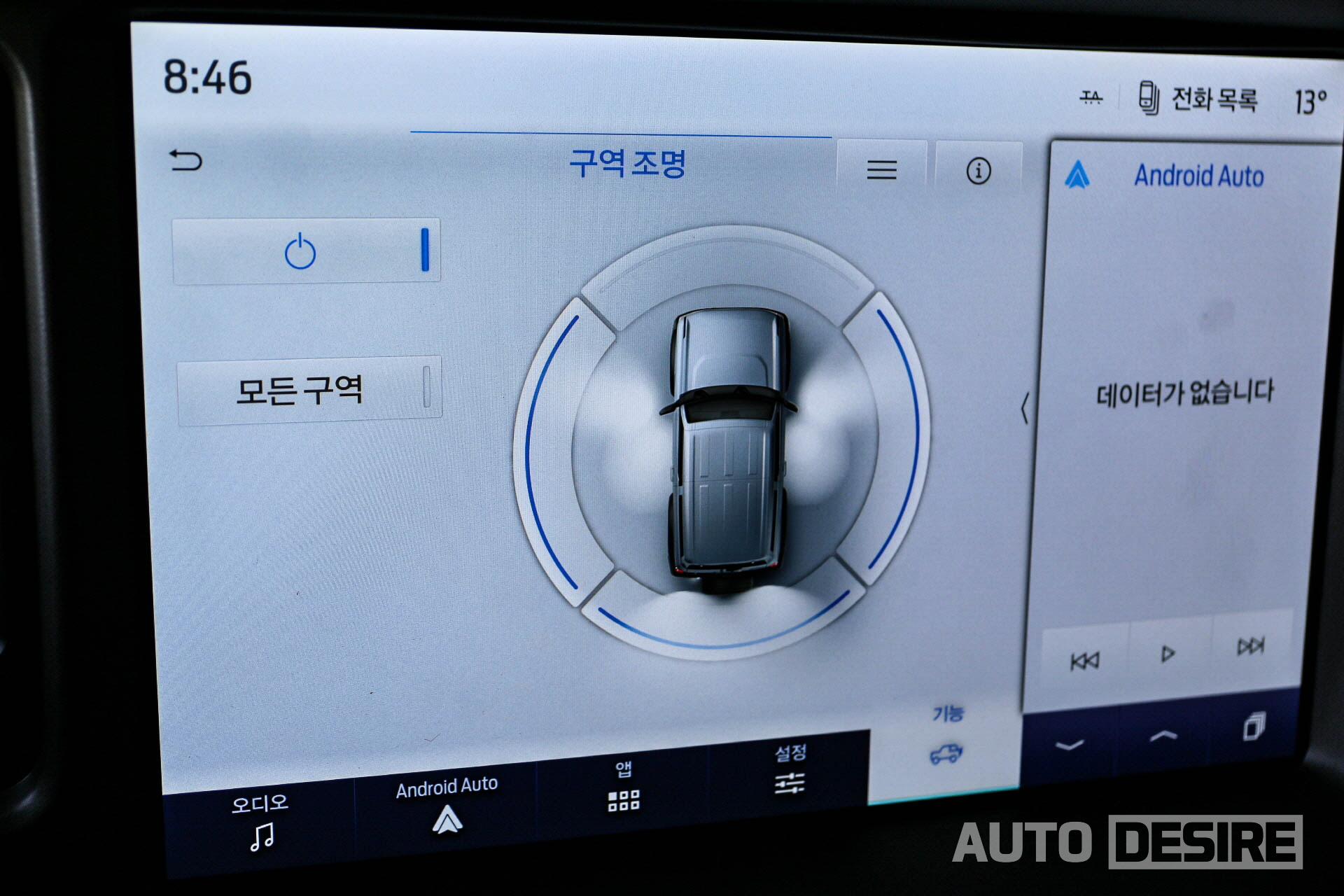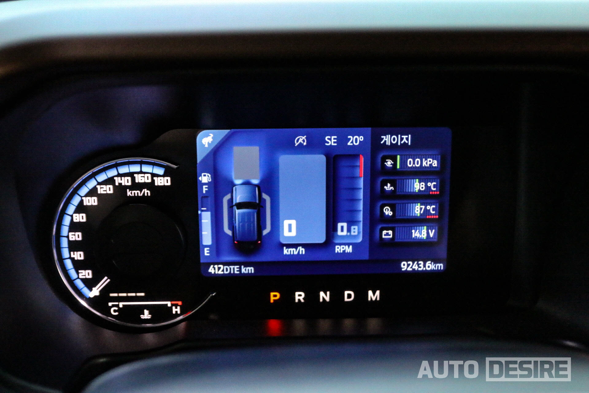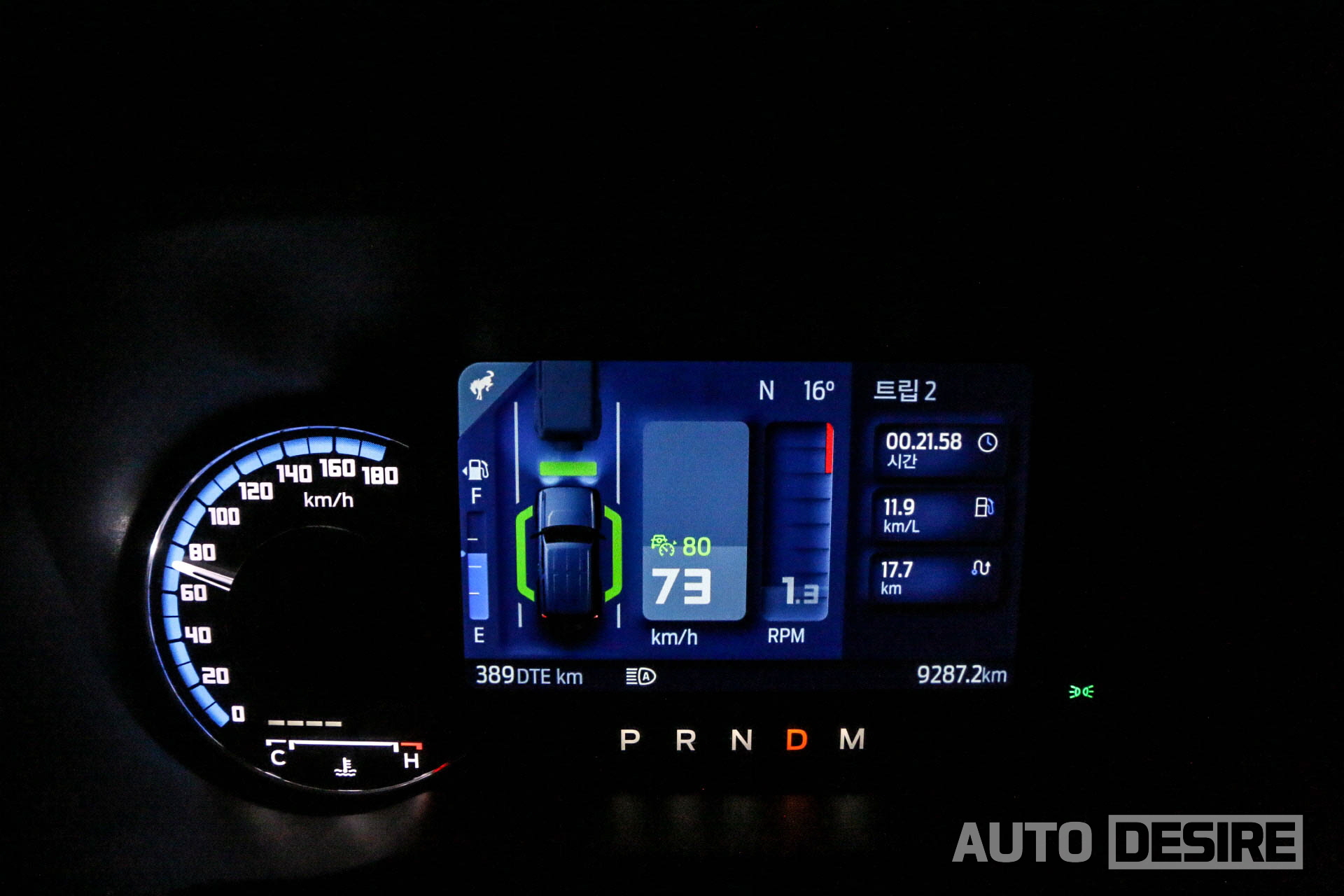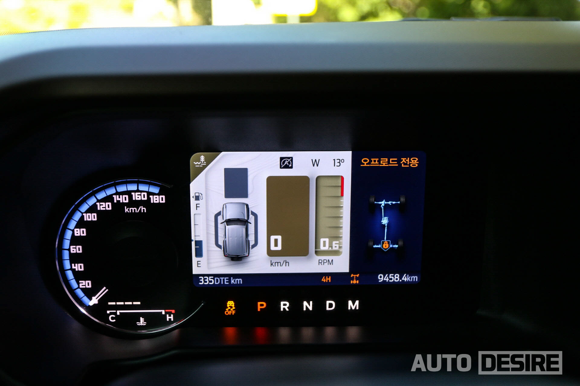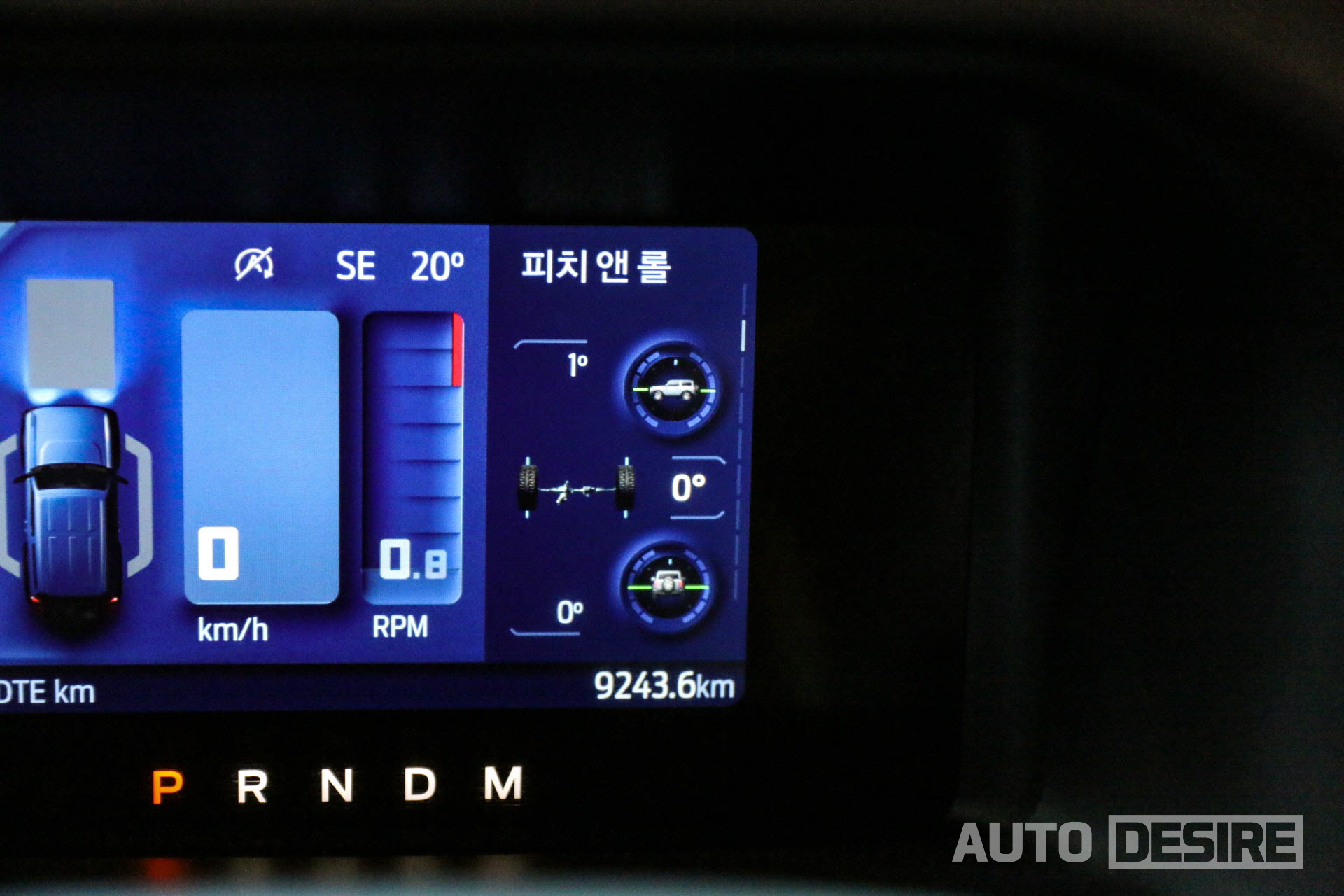 계기판의 경우 풀 디지털 타입은 아닌 아날로그 타입의 속도계와 8인치 디지털 클러스터가 혼용된 형태. 디지털 정보 창을 통해 연료량과 디지털 속도계, 타코미터 외에도 오프로드 주행에 참고할 수 있는 피치&롤, 구동력 배분, 오프로드 주행 모드, 나침반, 터보 부스트, 유온, 배터리 전압 등 다양한 정보를 확인할 수 있는 점이 좋으며, 해당 정보들은 센터 디스플레이 창에서도 연동이 된다.