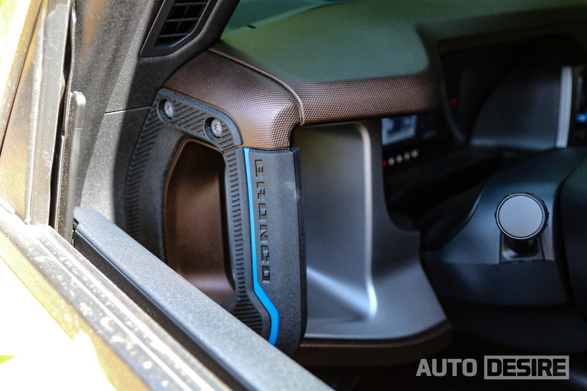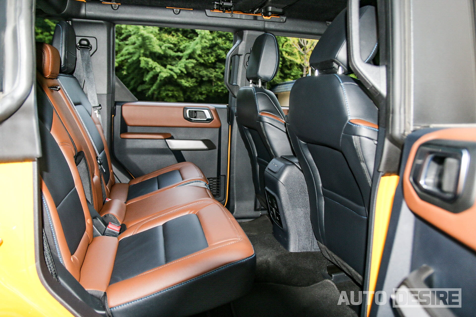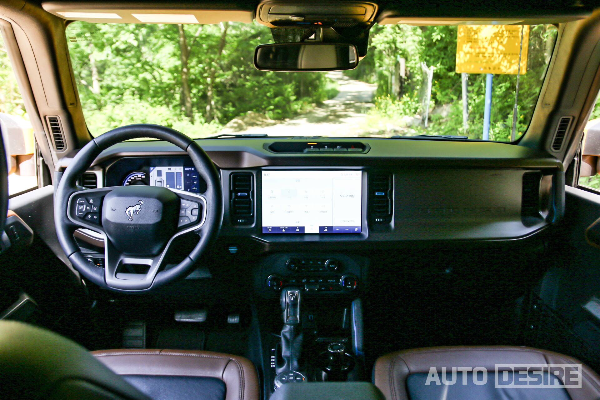 실내로 들어오면 송풍구, 디스플레이, 각 버튼류의 배치가 선을 딱딱 맞춰 배치된 다소 투박하고 무심한 듯한 느낌을 주기도 하지만, 브롱코 야생마 엠블럼 펀칭이 더해진 블랙/브라운 투톤 가죽 시트와 두툼한 림과 입체감이 있는 혼커버가 적용된 가죽 스티어링 휠, 브롱코 레터링과 블루 포인트 컬러를 적용한 사이드 그립 등등 기대 이상으로 디테일을 챙긴 모습들도 확인할 수 있다. 야생마 엠블럼은 혼 커버와 기어 노브에도 적용되어 있다.
