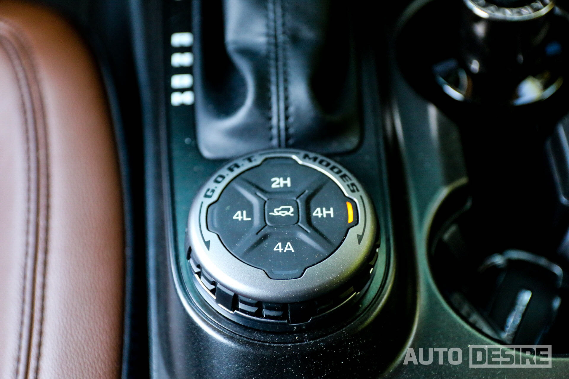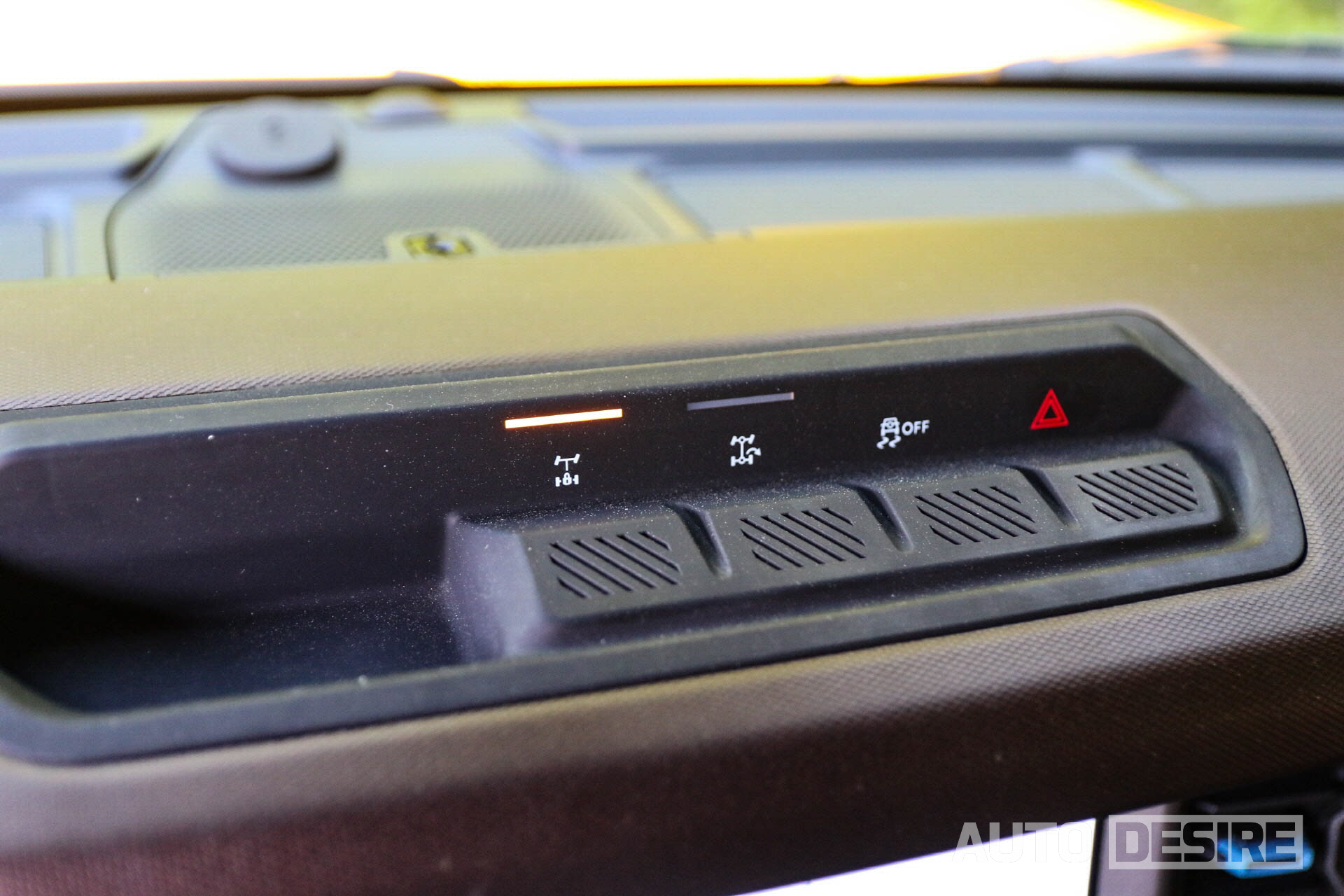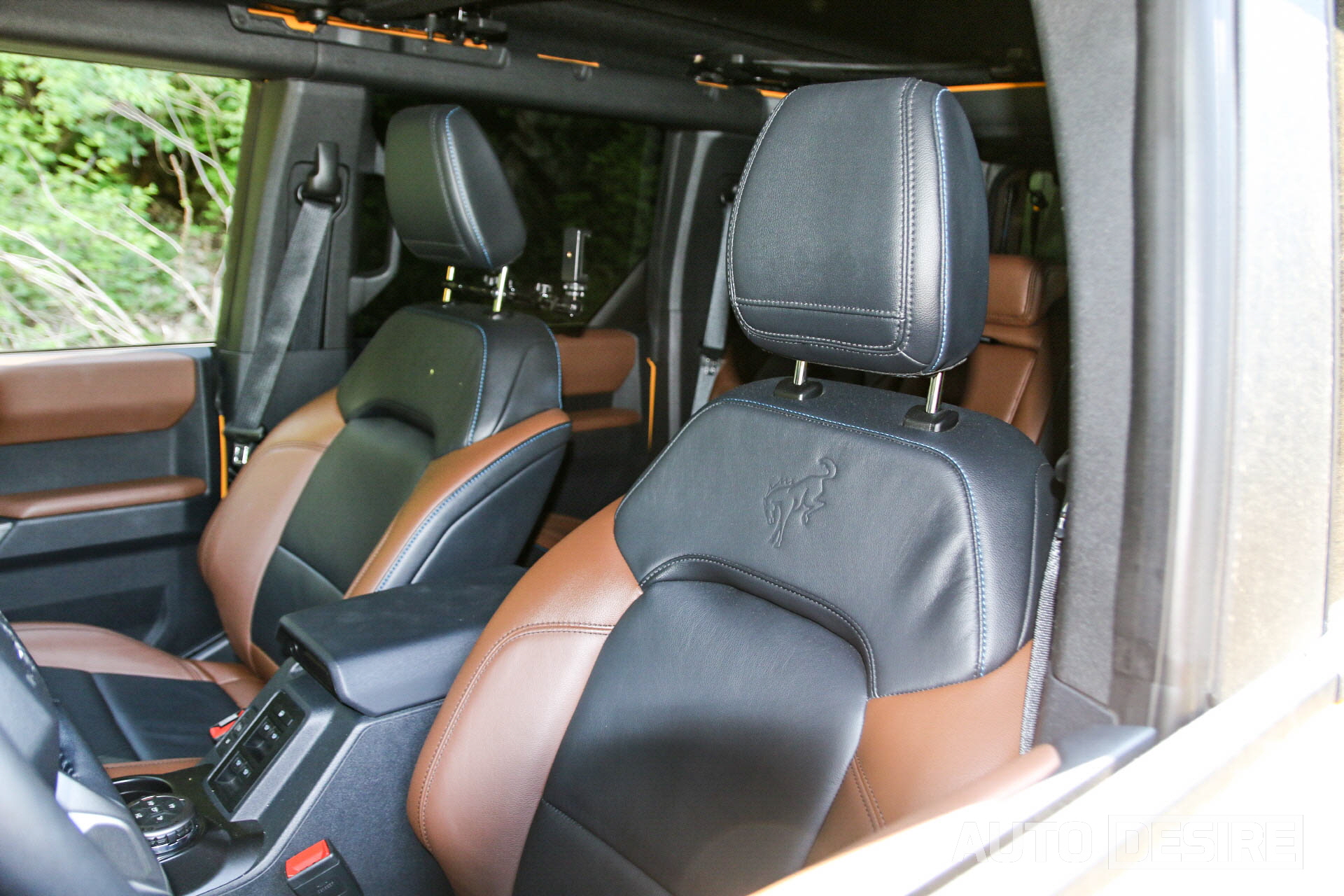실내로 들어오면 송풍구, 디스플레이, 각 버튼류의 배치가 선을 딱딱 맞춰 배치된 다소 투박하고 무심한 듯한 느낌을 주기도 하지만, 브롱코 야생마 엠블럼 펀칭이 더해진 블랙/브라운 투톤 가죽 시트와 두툼한 림과 입체감이 있는 혼커버가 적용된 가죽 스티어링 휠, 브롱코 레터링과 블루 포인트 컬러를 적용한 사이드 그립 등등 기대 이상으로 디테일을 챙긴 모습들도 확인할 수 있다. 야생마 엠블럼은 혼 커버와 기어 노브에도 적용되어 있다.