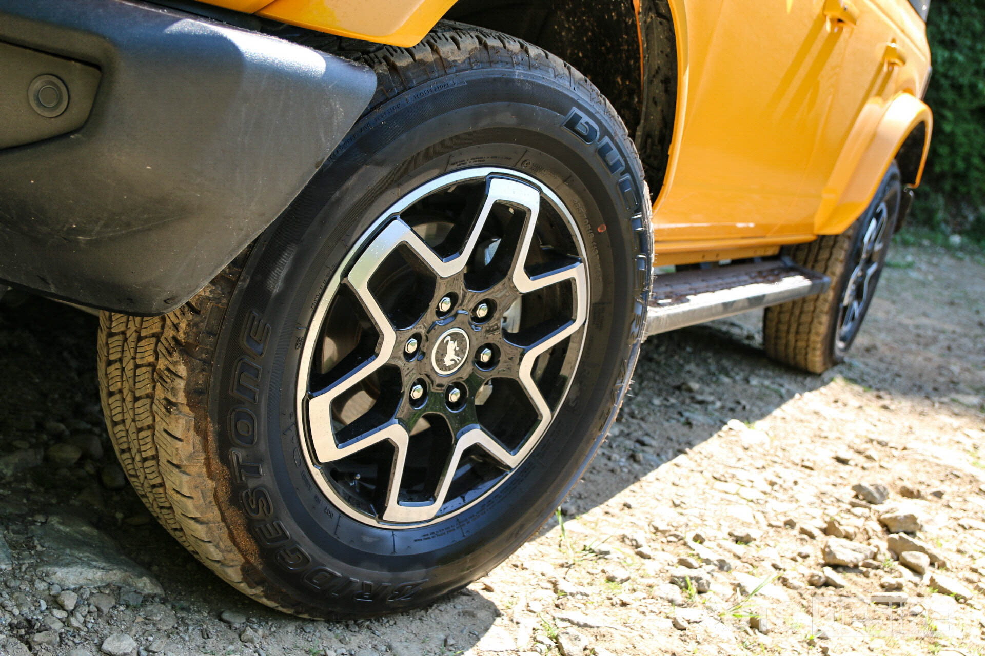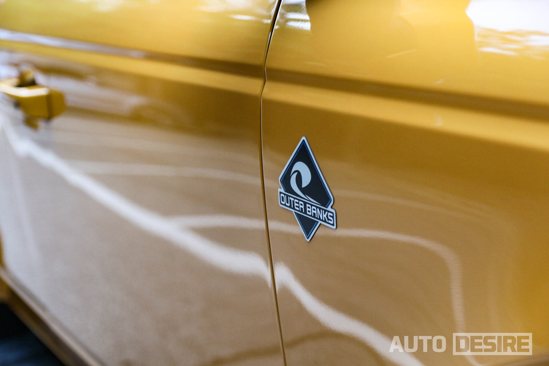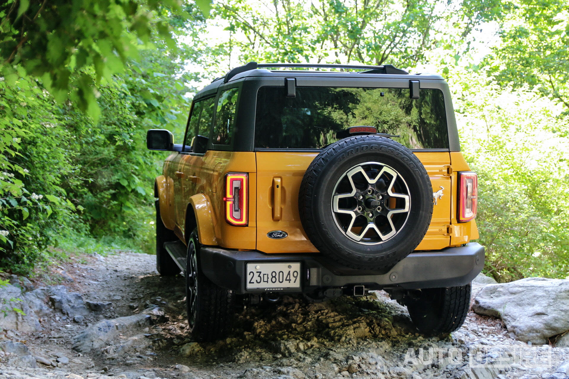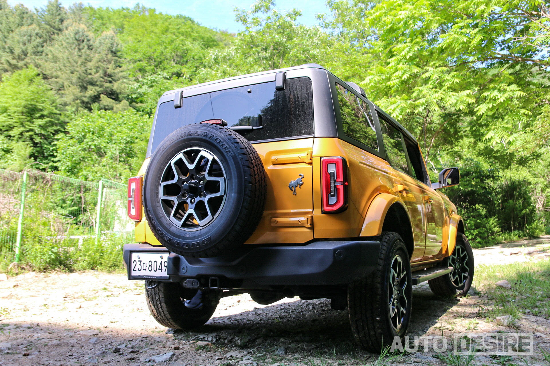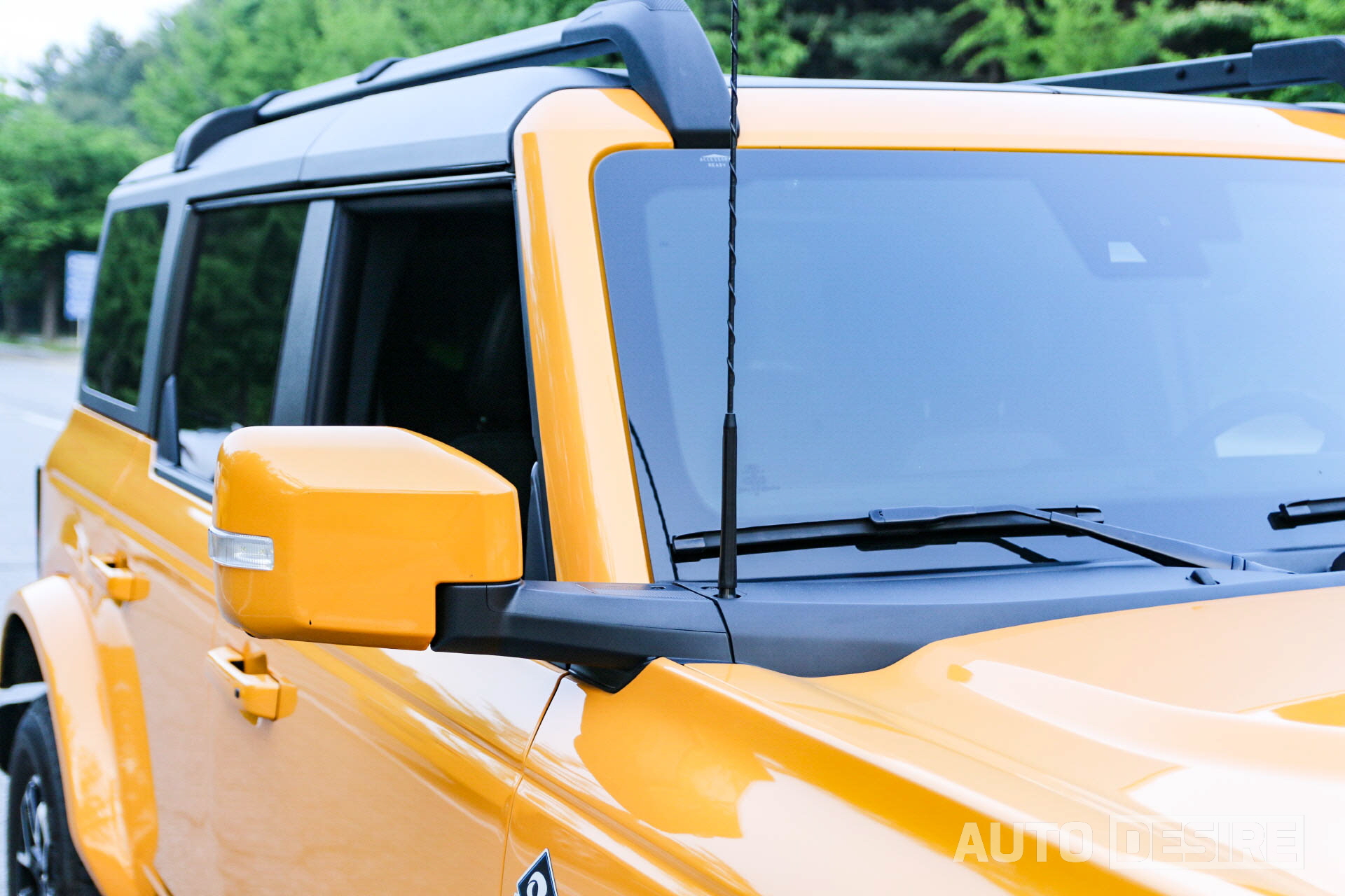 하드탑 루프는 탈부착이 가능하지만 시승차의 경우 루프랙이 장착되어 있고 간섭이 생기기 때문에, 루프랙을 공구로 해체해야만 루프를 열 수 있어 시승하는 동안 아쉽게도 개방은 해볼 수 없었다. 이 외에 승하차를 편리하게 도와주면서도 오프로드 주행 시 파손되지 않도록 튼튼한 소재의 사이드 스텝이 장착되어 있고, 펜더에 아우터뱅크스 로고를, 휠캡에도 포드 엠블럼 대신 브롱코를 상징하는 뒷발을 든 야생마 엠블럼이 장착되었다.