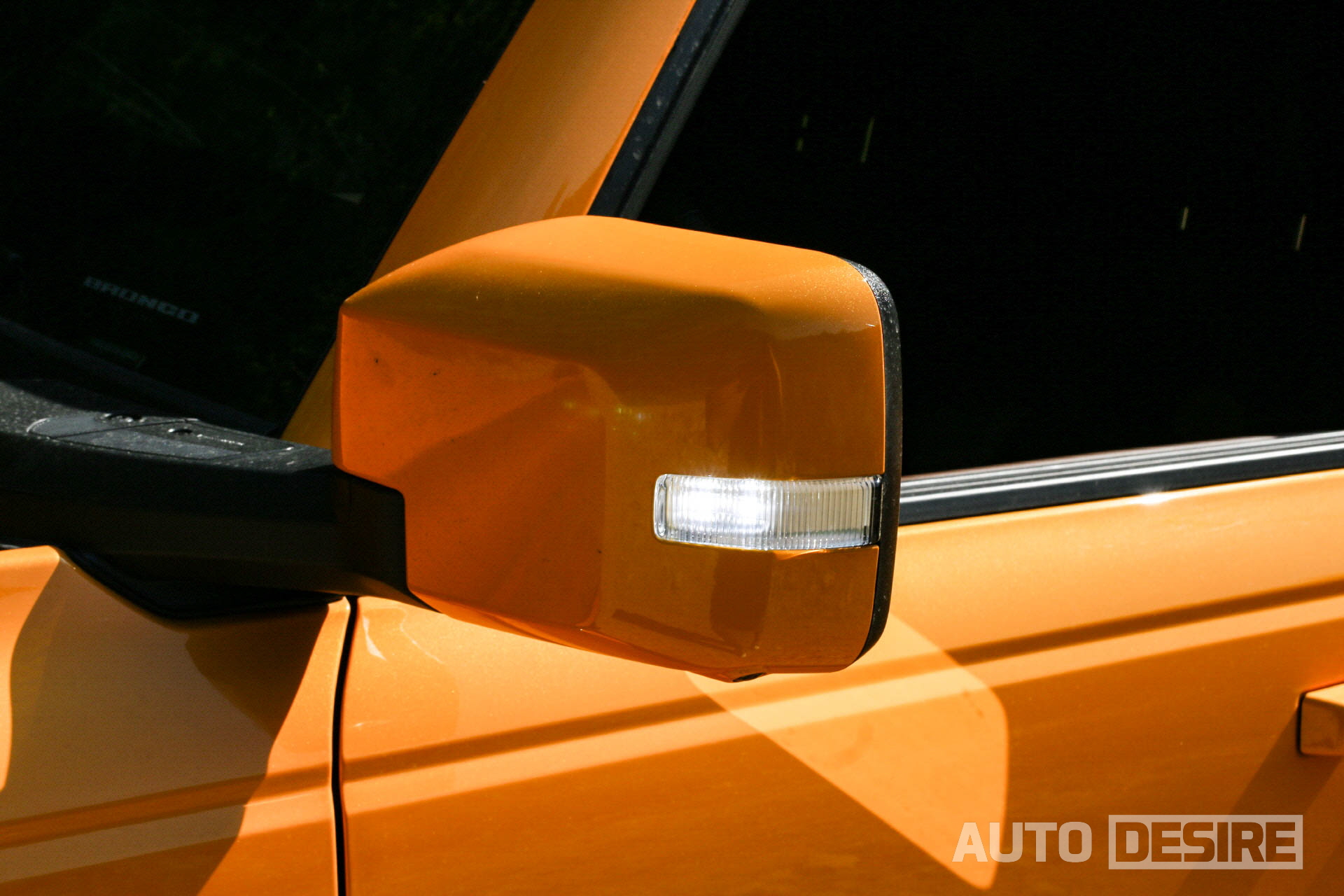 측면의 라인은 정통 오프로더의 정석대로 앞뒤 오버행이 극단적으로 짧은 각진 2박스 형태를 가지고 있으되, 프레임리스 타입의 윈도우와 어두운 색상의 하드탑을 통해 차체 색상과 강한 대비감과 개방감을 전해주고, 2열 윈도우 끝부분의 계단형 디자인 처리와 도어를 떼어냈을 경우에도 측후방 시야를 확인할 수 있도록 사이드 미러를 도어가 아닌 후드의 카울 커버와 이어져 장착되어 있는 것에서 브롱코 만의 특징과 장점을 알 수 있다.