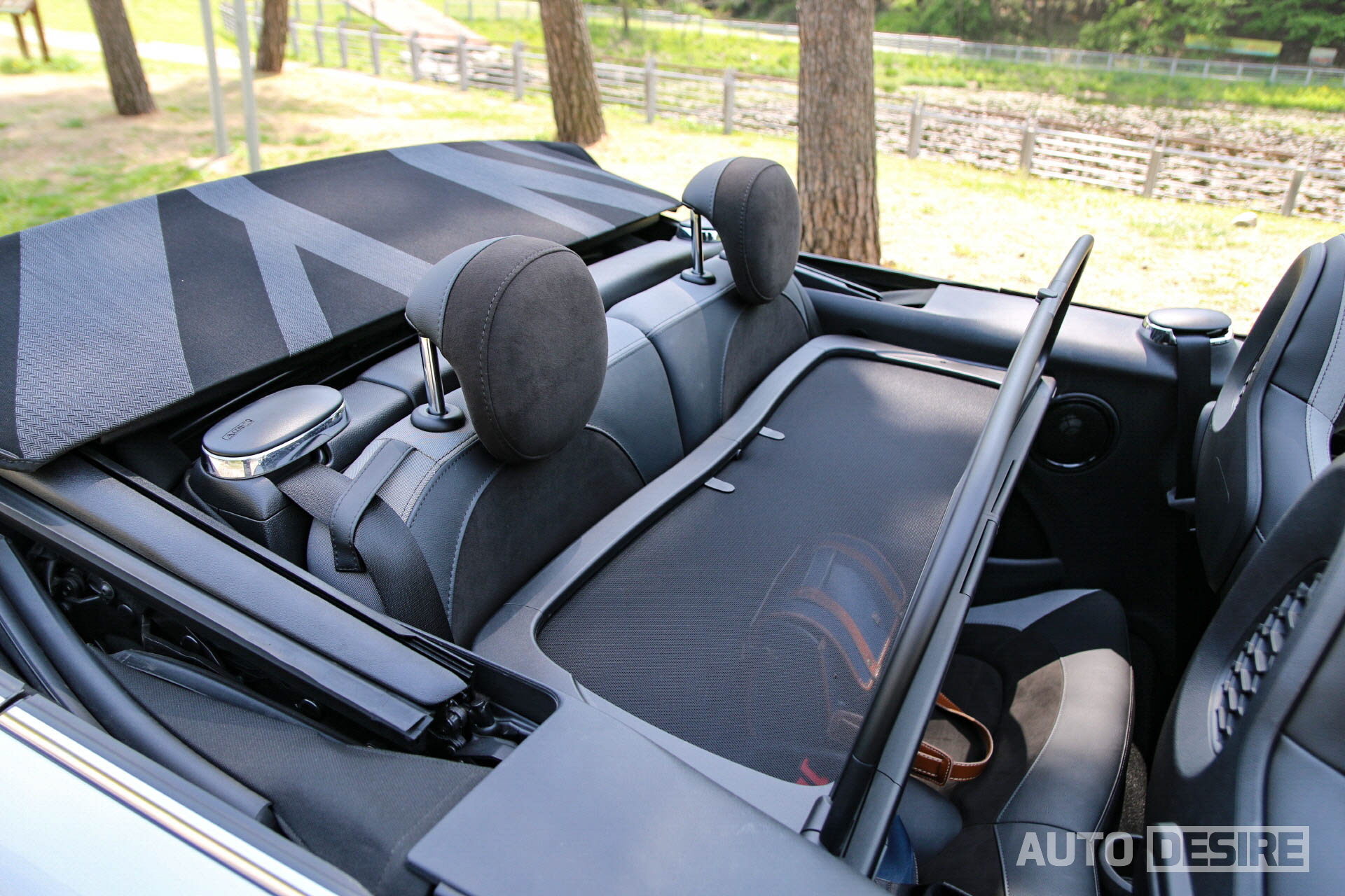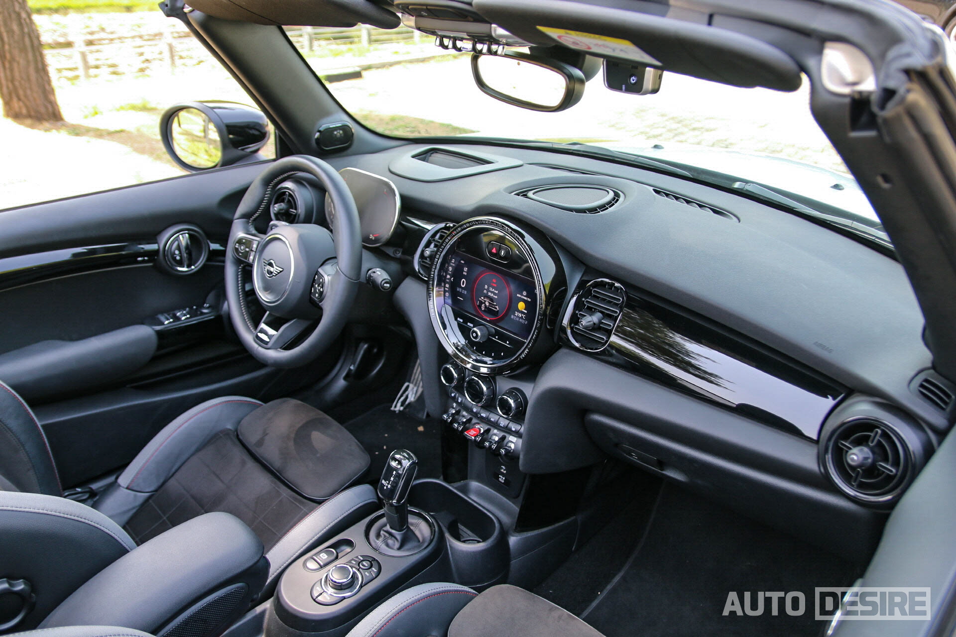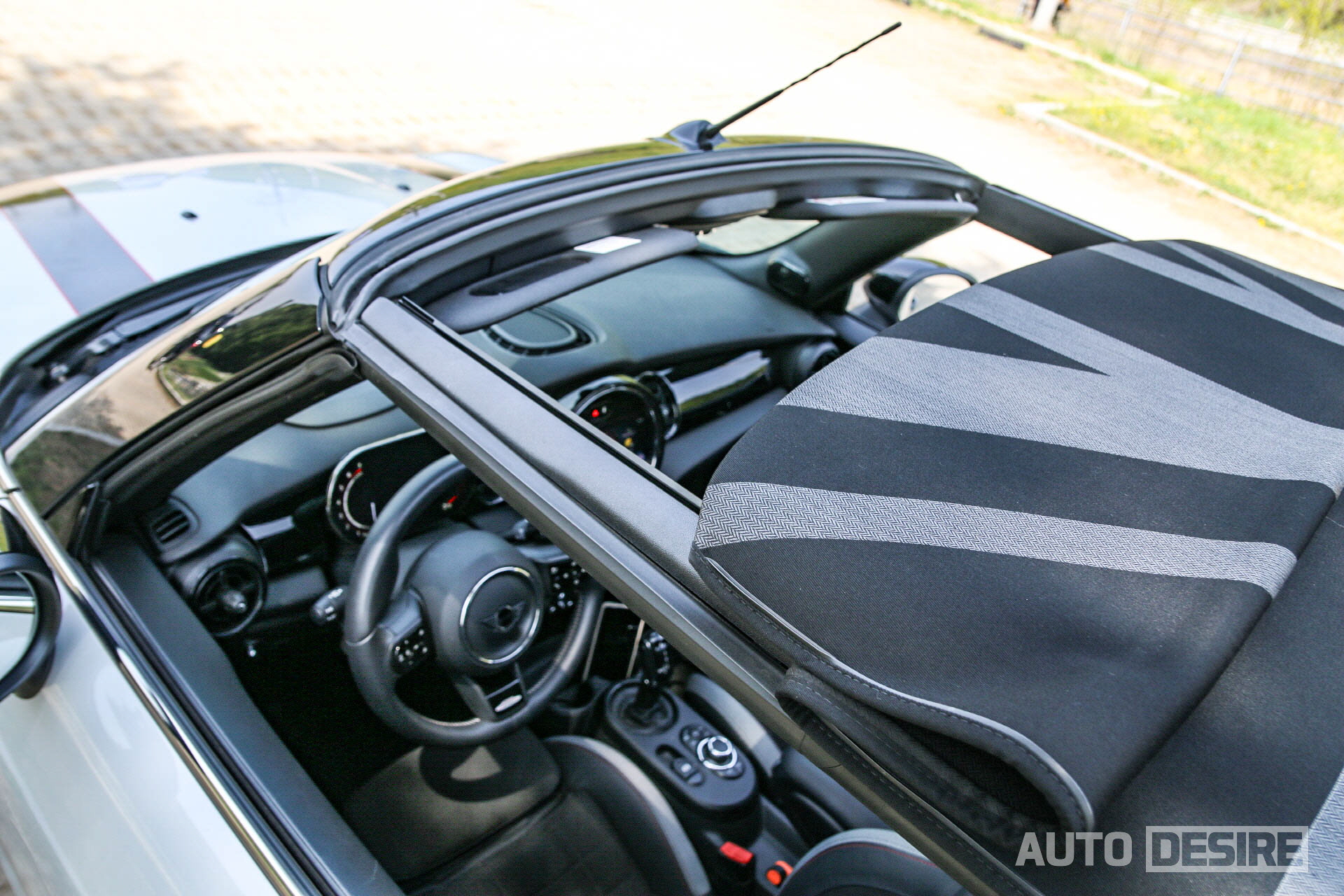 그리고 해치백과 컨버터블을 구분 짓는 가장 중요한 요소인 소프트탑이 컨버터블 모델을 선택하게 만드는 이유이자 가장 큰 특징. 탑을 닫았을 때 해치백 모델과 유사한 라인을 유지하고 있는 점, 또 완전히 오픈이 가능할 뿐만 아니라 원하는 정도에 따라 앞부분만 살짝 열어 선루프처럼 활용이 가능한 점은 다른 세그먼트, 다른 브랜드의 컨버터블 모델과 비교해도 미니 컨버터블 모델의 돋보이는 장점이라 할 수 있다. 이런 구성은 컨버터블 쿠퍼 S와도 동일하지만, 컨버터블 JCW에서는 여기에 유니언잭 디자인을 적용해 미니의 정체성을 살린 차별화된 모습을 전한다.