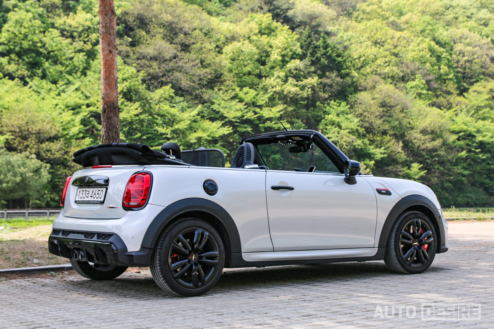 후면부에서도 테일게이트 몰딩과 리어 콤비네이션 라인, 엠블럼, 하단 디퓨저까지 블랙 포인트 컬러를 적용했고 리어램프 유니언잭 그래픽도 다른 미니 해치백과 동일한 부분. 테일게이트 우측의 JCW 엠블럼과 함께 하단의 넓은 디퓨저와 중앙에 자리 잡은 듀얼 머플러가 고성능 모델임을 나타낸다. 해치백과 차이점이라면 소프트탑 특성상 리어 스포일러, 리어 와이퍼가 빠졌고 LED 보조제동등이 해치백은 리어 글라스 상단에 있지만 컨버터블은 테일게이트 상단에 바로 위치에 있다는 점. 또 하나의 차이점으로 3도어 JCW은 18인치 서킷 스포크 휠이 장착되지만, 컨버터블 JCW에는 17인치 트랙 스포크 블랙 휠이 적용된다. 휠 사이즈가 살짝 아쉽기는 하지만, 디자인 자체는 트랙 스포크 휠도 충분히 스포티한 느낌이 난다.