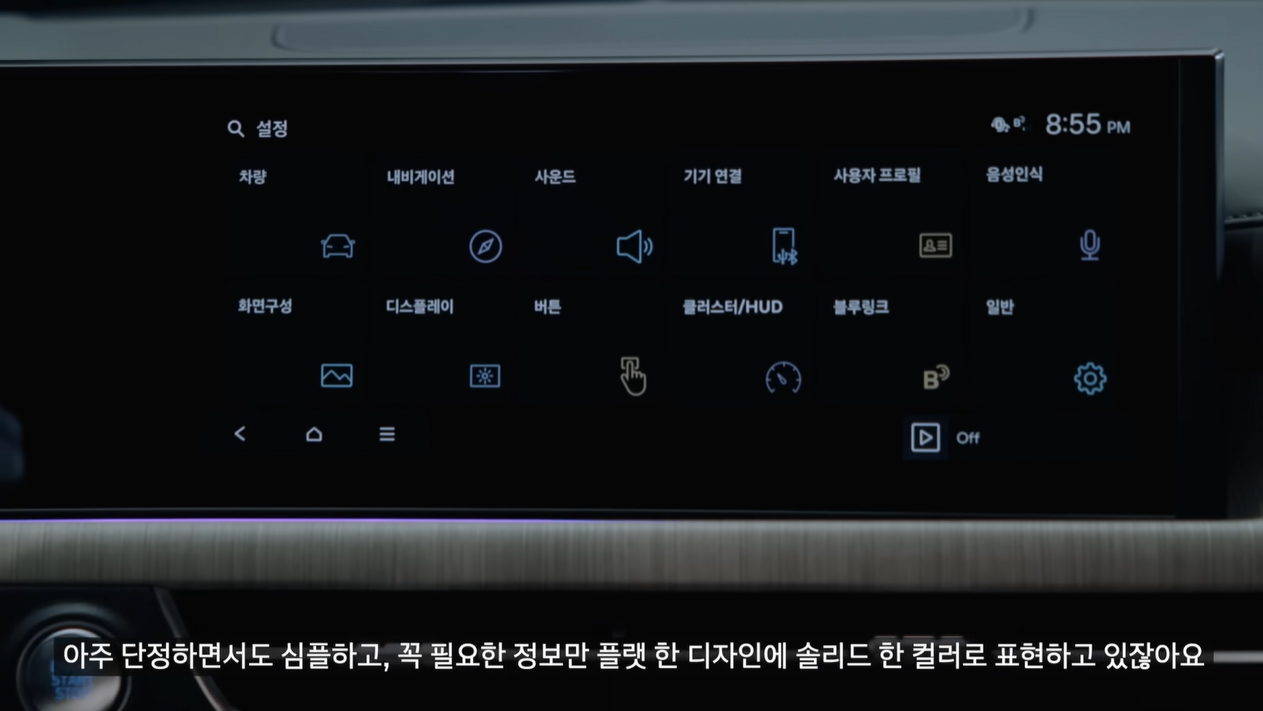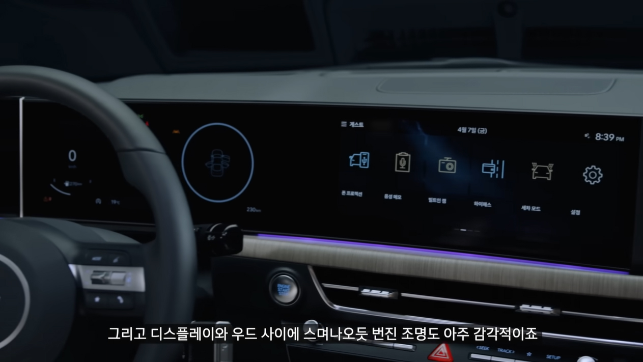 파노라믹 커브드 디스플레이 하단에 함께 이어지는 앰비언트 무드 조명과 함께 넓은 면적의 엔지니어드 우드 패턴 가니시를 적용해 정갈하고 차분하면서도, 세련된 느낌을 준다.
