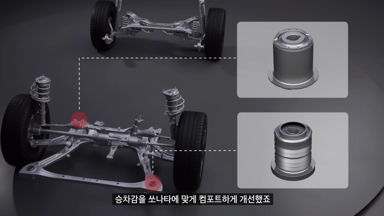 뿐만 아니라 전륜 서스펜션 마운트 부분에 스트럿 링을 추가해서 노면에서 올라오는 진동을 더 줄이고, 전륜 서브 프레임 부시를 하이드로 부시로 변경, 후륜 범프 스토퍼의 길이도 줄여 출렁거림을 줄이고 컴포트한 승차감으로 개선을 이뤘다고 한다. 이 외에도 브레이크 부스터 사이즈와 배력비를 증대해 제공 감각도 개선을 이뤘다고 하니, 특히 기존 8세대 쏘나타를 경험해 본 분들이라면 신형 쏘나타 디 엣지 시승을 통해 달라진 부분들을 느낄 수 있을 것이다.