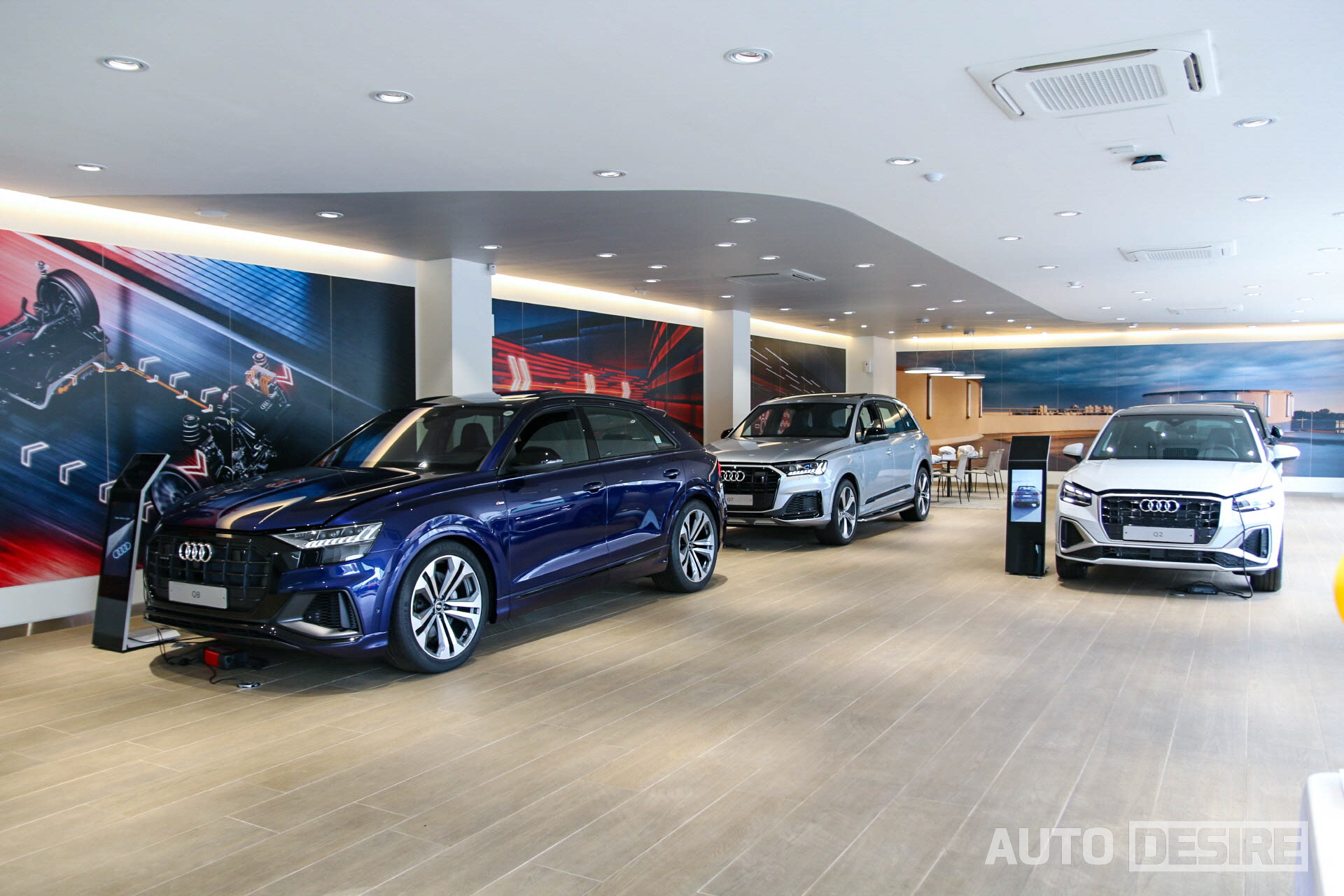 1층 전시 공간에는 여름 시즌을 맞이해 인기가 높아지리라 생각되는 SUV 라인업으로 구성, 아우디 SUV 모델 중 플래그십 대형 모델들인 Q8, Q7과 함께 중형급인 Q5 스포트백과 막내 모델인 Q2까지 소형-대형을 아우르는 다양한 모델들을 살펴볼 수 있고,