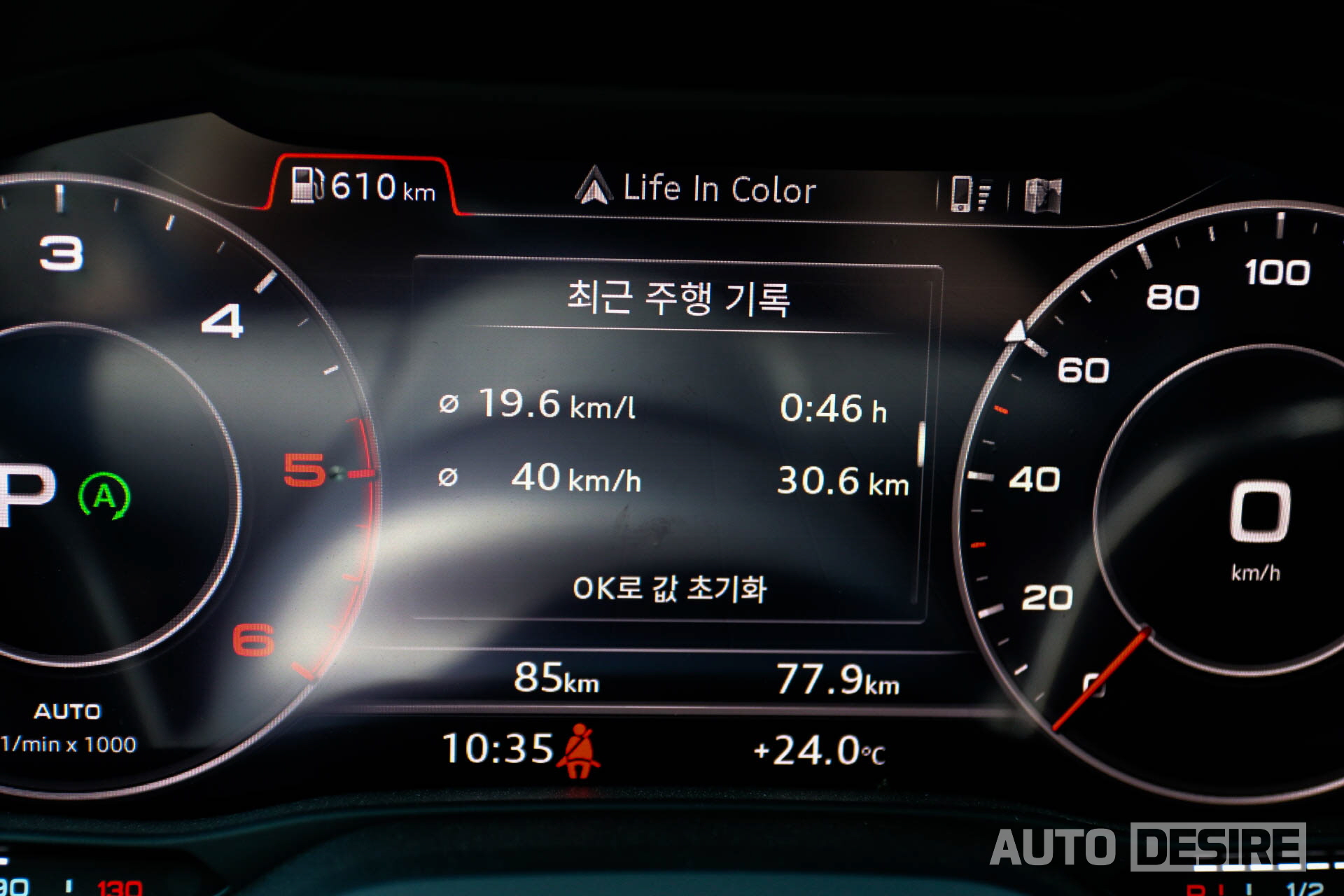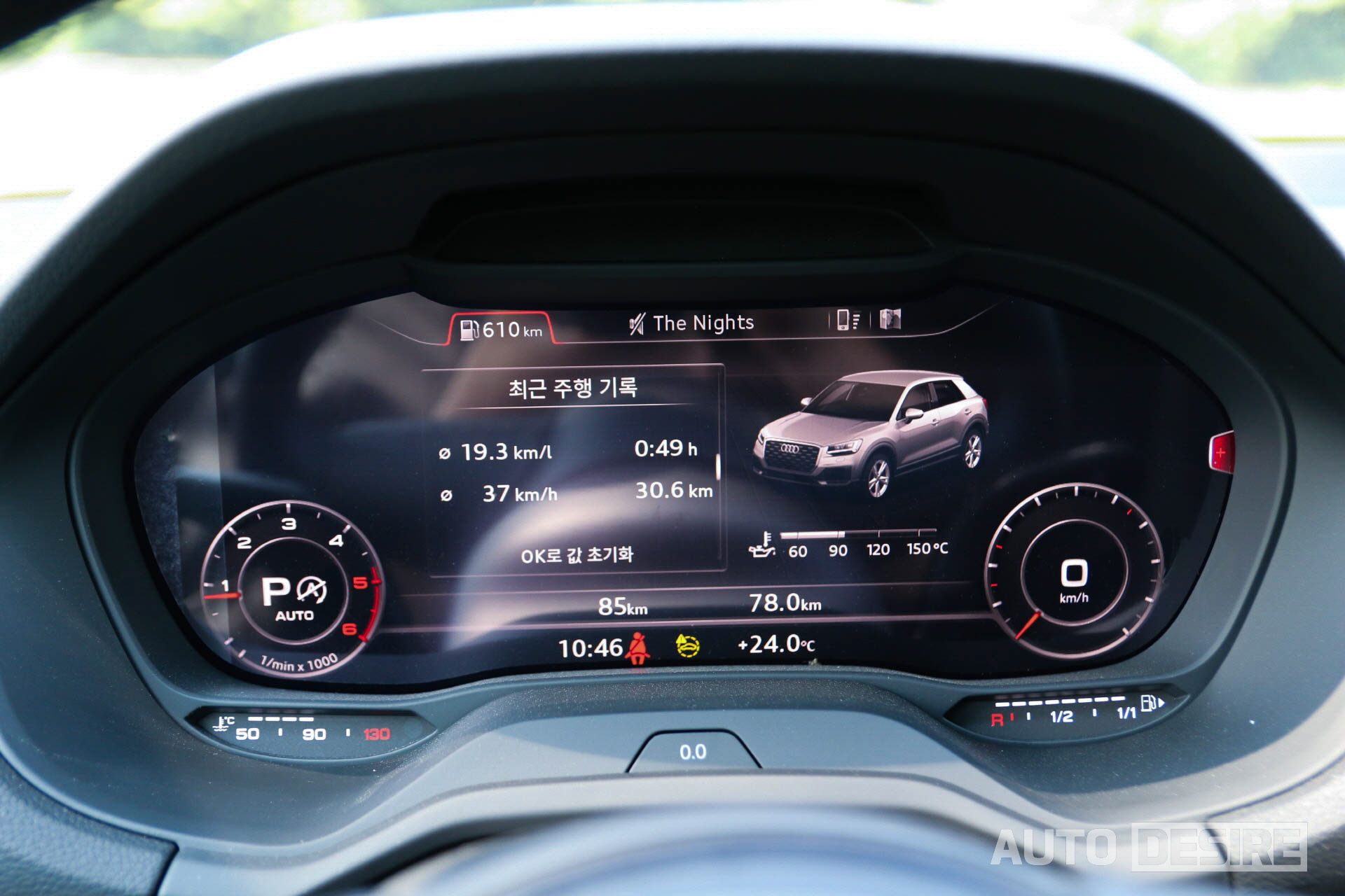 TDI 엔진과 S트로닉 변속기의 조합으로 연비 역시 좋은 모습. Q2 35TDI 프리미엄의 공인 복합 연비는 16.7km/L, 도심 15.5km/L, 고속도로 18.5km/L로 공인 연비로도 꽤나 훌륭한 연비 수치를 가지고 있는데, 아우디 판교 전시장에서 용인 처인구 동부동 인근까지 대왕판교로 같은 도심 지역부터 수원-용인을 잇는 신중부대로 자동차 전용도로 구간, 이후 용인 운학동까지 이어지는 왕복 2차로 도로까지 30km의 복합적인 구간에서 기록한 연비는 19.6km/L로 뛰어난 효율성을 보여줬다. 고속도로로만 주행하게 된다면 22~23km/L 이상 연비도 무리 없이 발휘할 것 같다. 콤팩트한 차체와 디젤 엔진의 효율성을 제대로 살린 모습이다.