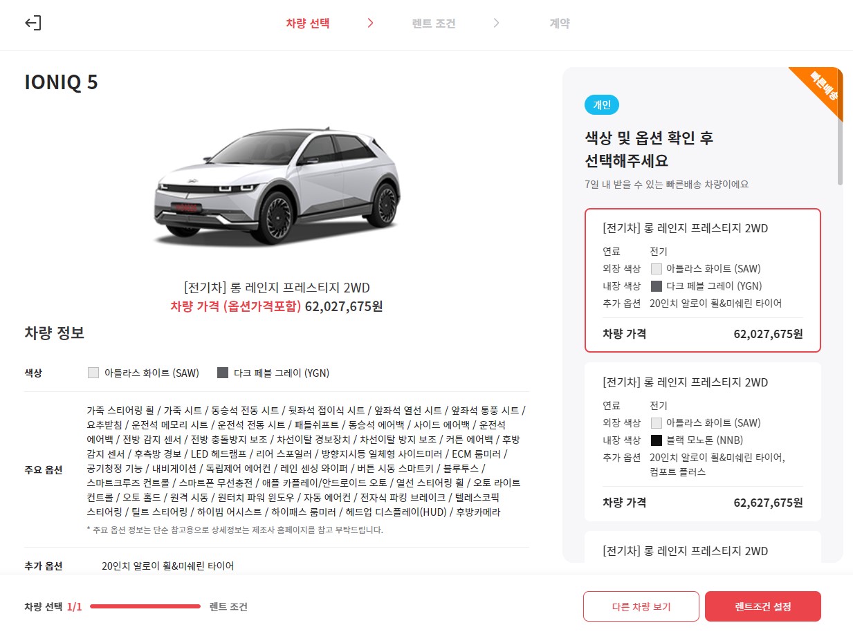 SK렌터카 다이렉트 신차 장기렌터카 홈페이지(PC, 모바일 모두 가능)를 이용하면 이번에 소개한 아이오닉 5를 비롯해 원하는 차종을 현재 보유 중인 실시간 재고로 확인이 가능해 계약자 본인이 원하는 색상과 옵션의 차량을 선택하고 계약할 수 있다. 게다가 이미 실시간 재고로 확보한 차량이기에 지금 계약해도 긴 출고 대기 기간 없이, 계약 후 7일 내에 빠르게 즉시 출고가 가능하다.