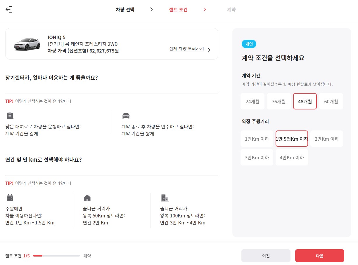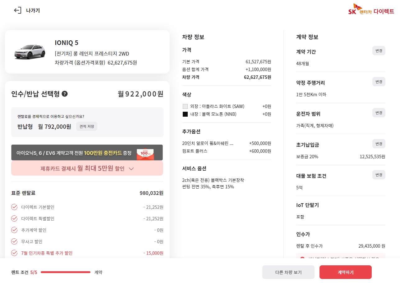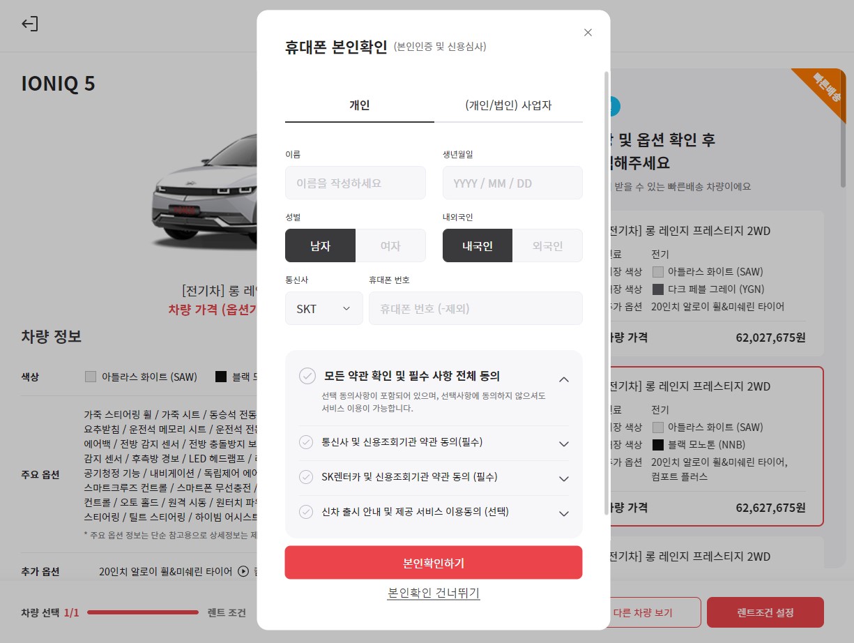 지금부터 아이오닉 5 신차 장기렌트카 온라인 견적을 함께 확인해보자. SK렌터카 다이렉트 홈페이지에서 ‘아이오닉 5’ 차량을 선택해서 실시간 재고를 확인 후, 정확한 렌탈료 체크를 위해 간편 본인확인을 마친 뒤 절차에 따라 견적 조건을 선택해주면 본인이 원하는 조건의 아이오닉 5 장기렌트카 계약 금액, 월 렌탈료를 바로 알 수 있다. 정확한 렌탈료와 7월 프로모션 할인 적용을 위해 본인확인은 꼭 진행하기를 추천한다.