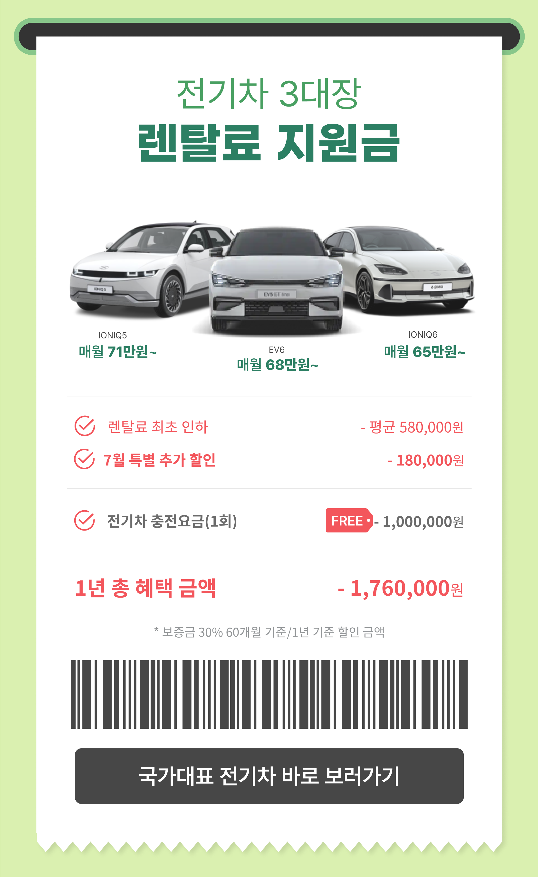 이번 달에 계약을 진행하게 되면 기본 렌탈료 인하 뿐만 아니라 7월 특별 추가 할인으로 계약 기간 내내 월 렌탈료 1만 5천원, 1년 기준으로 18만 원이나 더 절약할 수 있고, 충전비 100만 원도 지원(EV링크 카드)해주기 때문에 실 주행 거리에 따른 차이는 있을 수 있지만, 아이오닉 5 롱레인지 모델로 1년 1만 km 계약 기준 2년 동안 충전비 걱정 없이 주행할 수 있다.