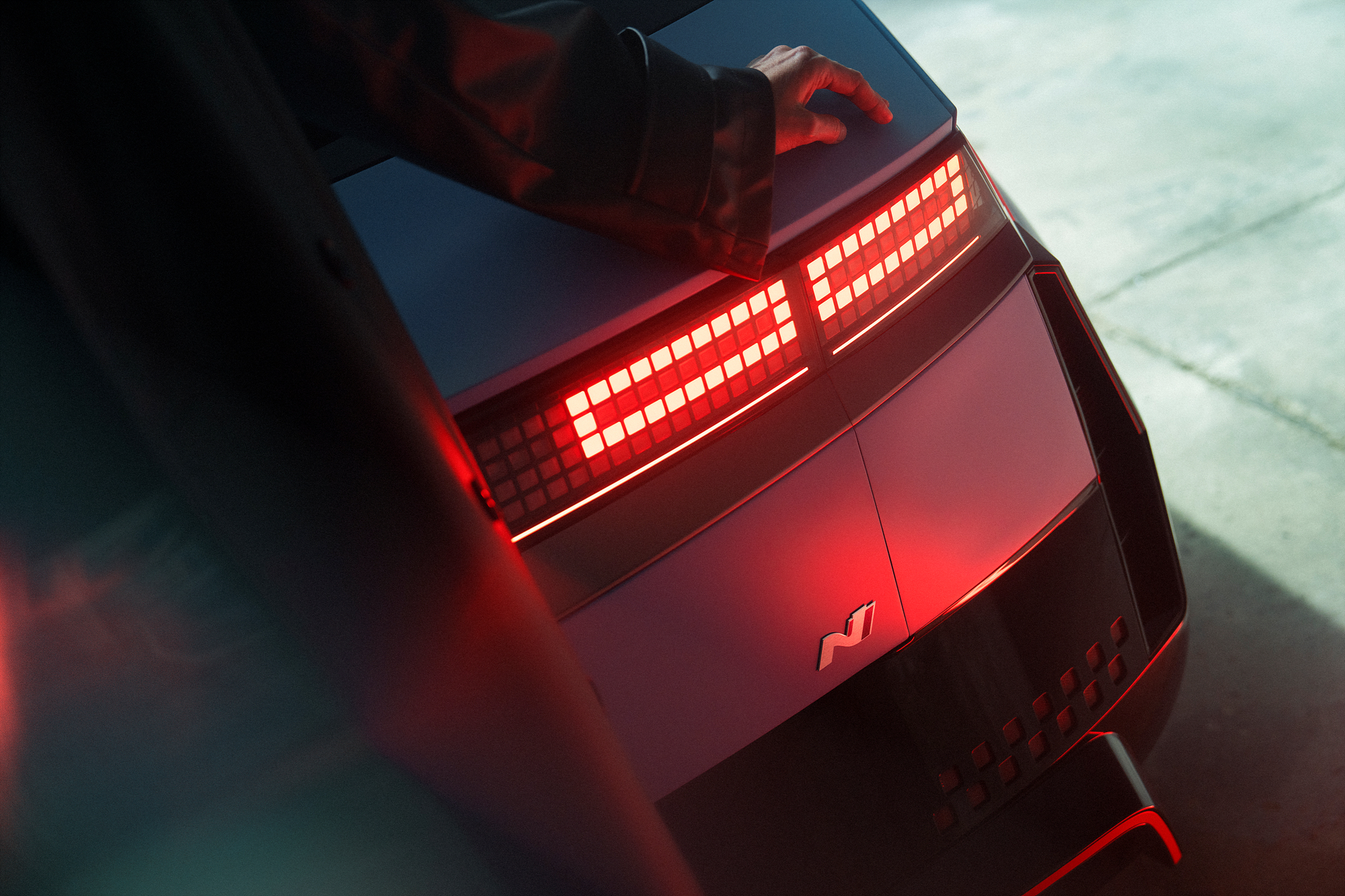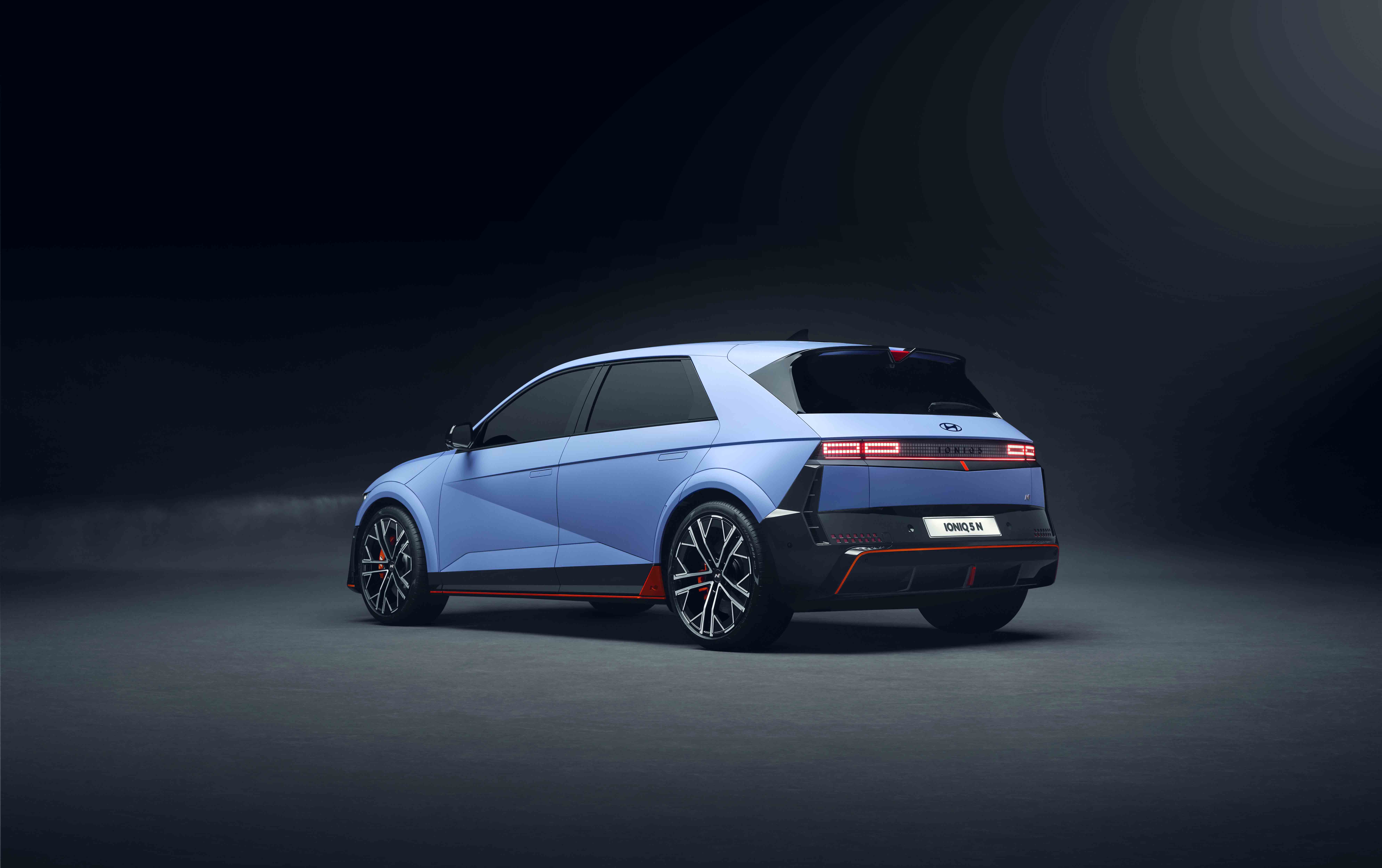 측면에는 아이오닉 5 기존 모델 대비 전고를 20mm 낮추고, 앞 범퍼에서부터 사이드 실까지 이어지는 EV N 전용 루미너스 오렌지 스트립을 적용해 더 낮은 자세를 완성했다. 후면에서는 기존 아이오닉 5 대비 100mm 더 길어진 N 전용 리어 스포일러와 에어 아웃렛 리어 디퓨저를 적용해 공력 성능을 개선하고, N 전용 삼각형 보조 제동등과 체커 플래그 그래픽을 적용한 리플렉터로 N 브랜드 만의 고성능 감성을 더 부각시켰다. 또 기존 아이오닉 5와 다르게 리어 글라스 와이퍼가 추가되었다.