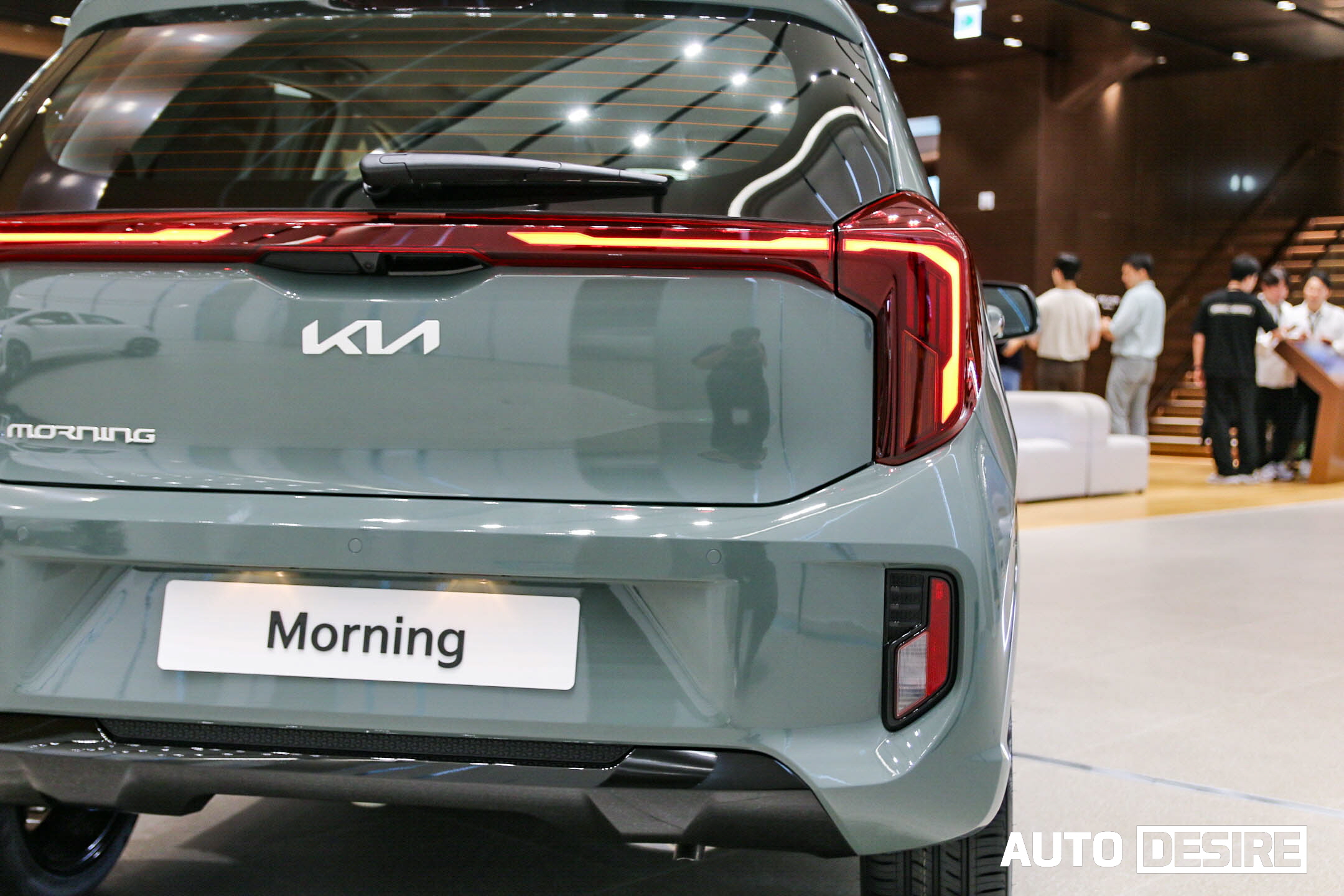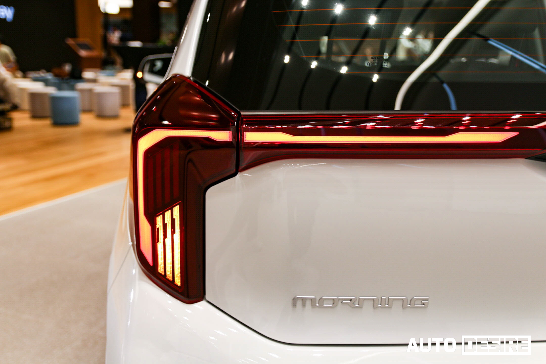 후면부에서도 전면 스타맵 시그니처 라이팅과 통일감을 이루는 '시그니처 리어 콤비네이션 램프'를 적용, 수직형으로 되어있던 기존 모닝의 리어램프의 좌우를 길게 이으면서 와이드한 느낌을 강조했고, 입체감과 엣지를 살린 신규 디자인의 리버 범퍼, 리플렉터 형상으로 기존 모닝 대비 좀 더 날카로우면서도 크롬 머플러 팁 데코 등을 삭제해 깔끔한 느낌을 준다.