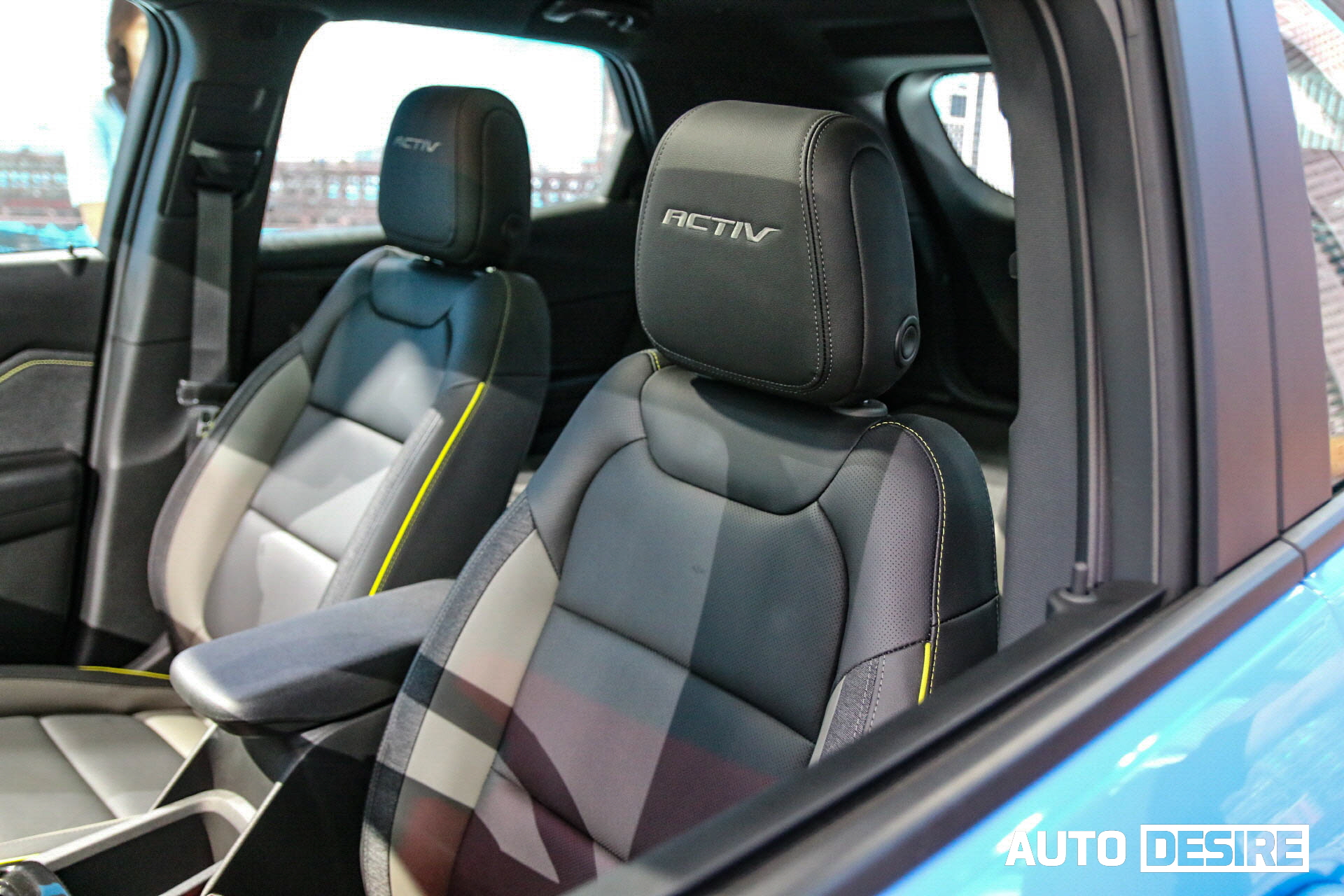 실내에서도 각 트림별 디자인 차별화 요소들은 이어져서, 액티브 트림에는 원형 스티어링 휠과 노란색 포인트 컬러가 적용된 젯 블랙&아르테미스 인테리어를 적용, 1열 시트 헤드레스트에도 액티브 로고 자수가 더해졌다. 액티브 트림의 인테리어 차별화는 먼저 출시된 트랙스 크로스오버와 공통되는 부분이기도 하다.