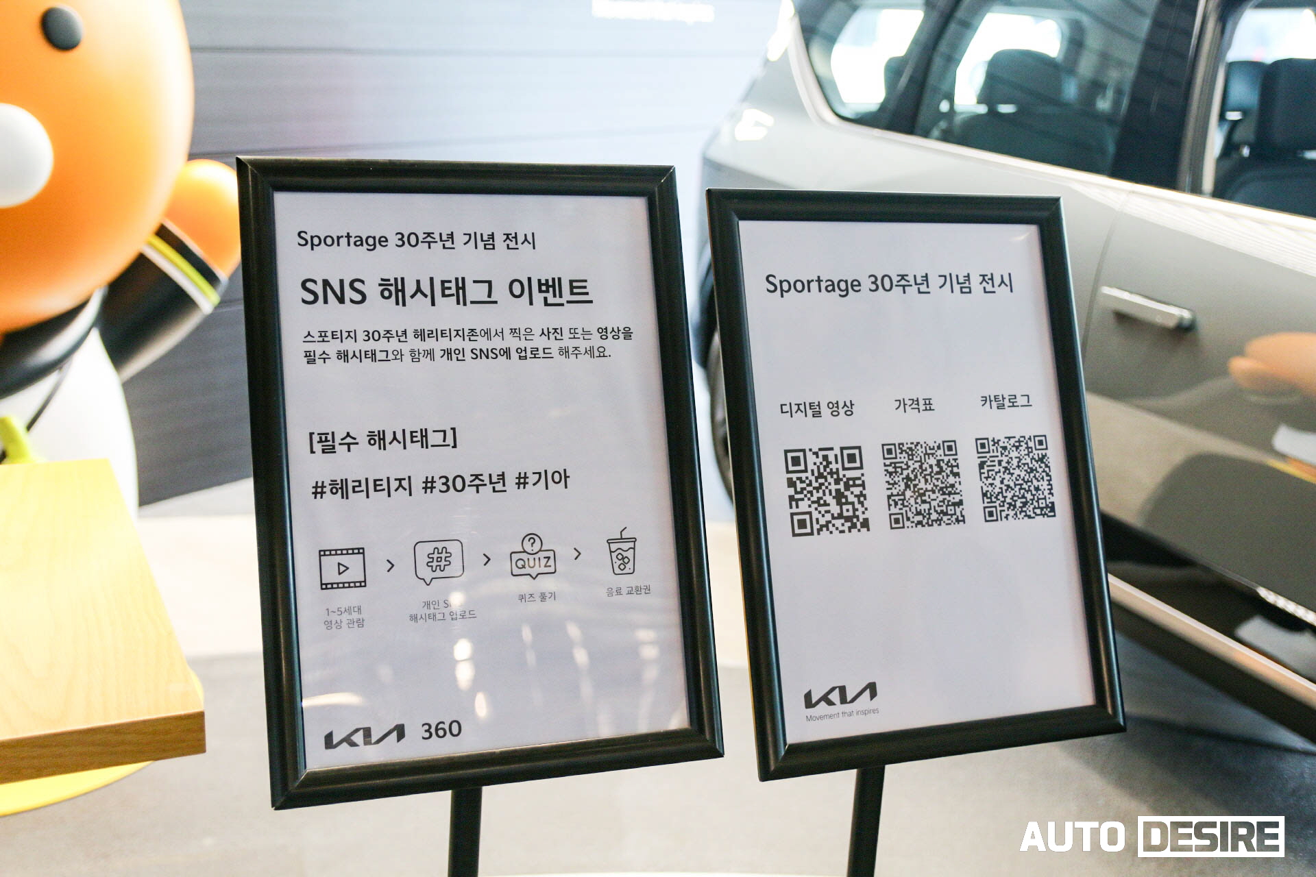 기아360에서 진행되고 있는 스포티지 30주년 기념 전시는 7월 27일까지 진행될 예정이며, 현장의 스포티지 30주년 헤리티지 존에서 찍은 사진이나 영상을 SNS에 필수 해시태그와 함께 스토리, 혹은 피드 게시물로 올린 뒤 스포티지와 관련된 간단한 퀴즈를 풀면, 바로 옆에 위치한 기아360 카페에서 이용할 수 있는 음교 교환권을 제공하고 있으니, 스포티지 30주년 에디션과 1세대 스포티지도 실물로 살펴보고, 시원한 음료도 한 잔 즐기는 시간을 가져보는 건 어떨까?
