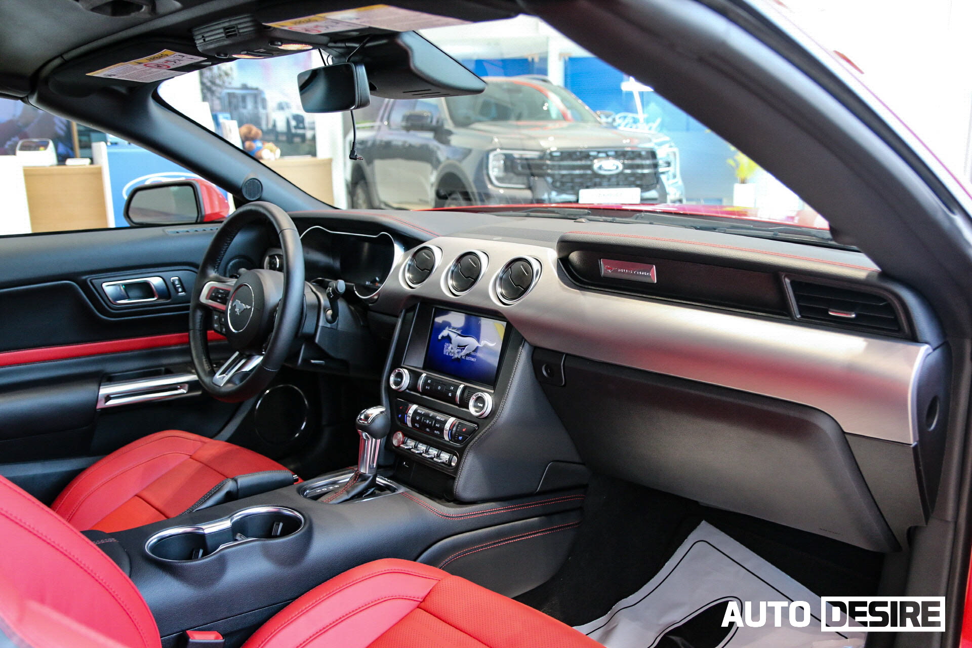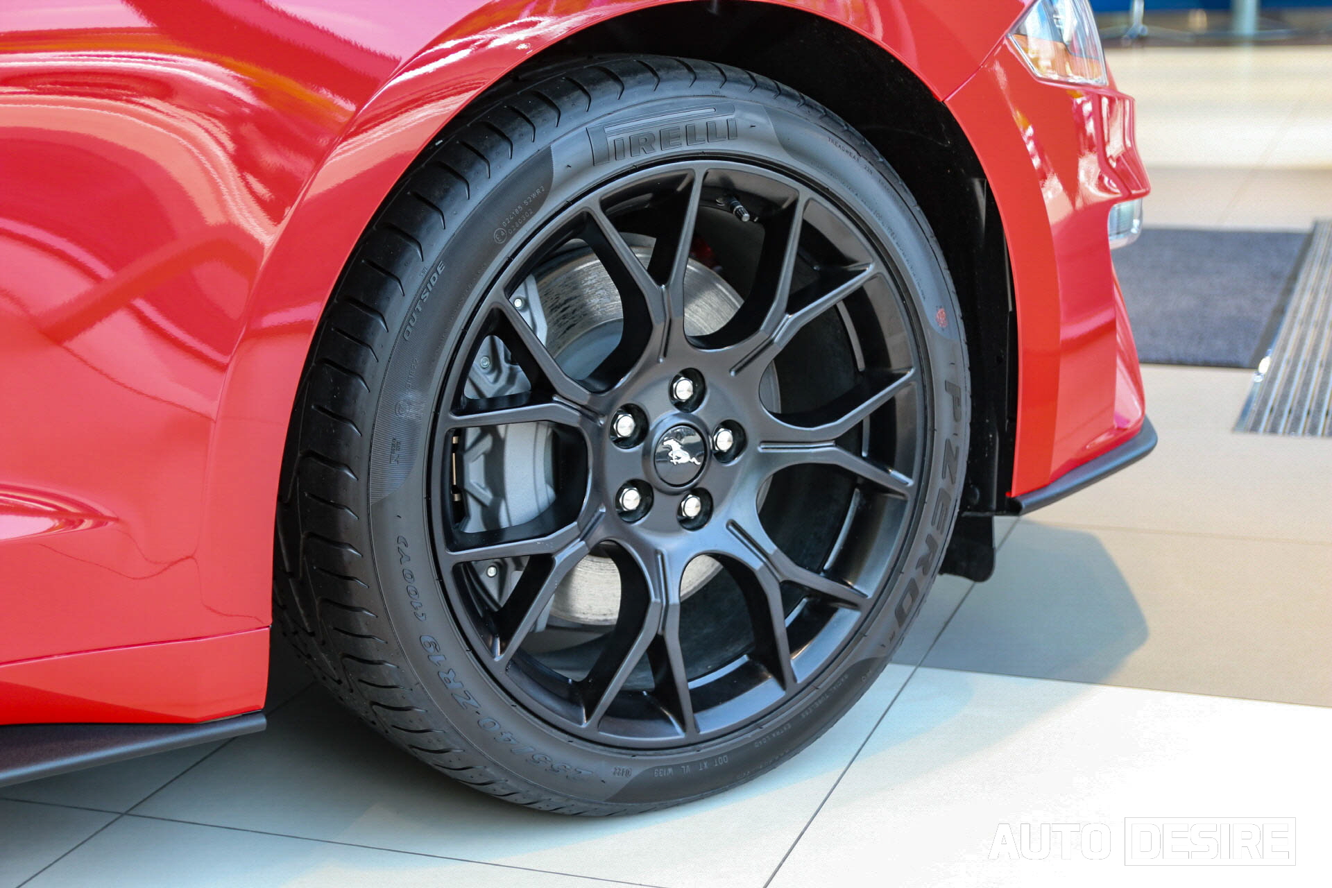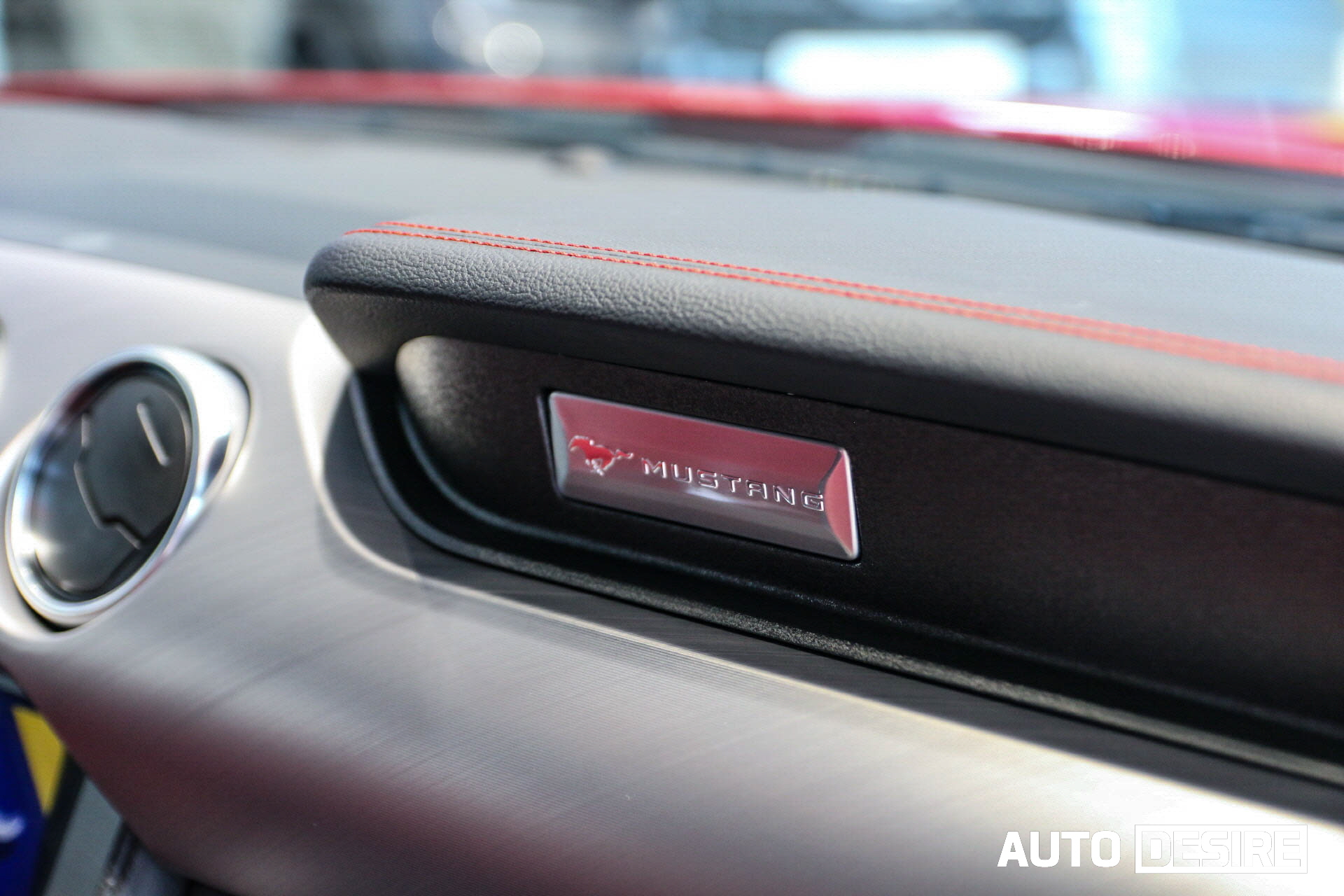 전시차는 레드 색상으로 스포츠카의 감성을 강렬하게 잘 느낄 수 있고, 에코부스트 모델의 트윈 7-스포크 휠은 블랙 컬러로 빨간 바디 색상과 조화를 이루면서 스포티한 감각을 더 강하게 끌어올려 준다. 먼저 살펴본 브롱코보다 더 오랜 헤리티지를 가진 머스탱 역시 기본 포드 엠블럼이 아닌 질주하는 야생마 엠블럼을 전면 그릴과 휠캡에도 적용했다.