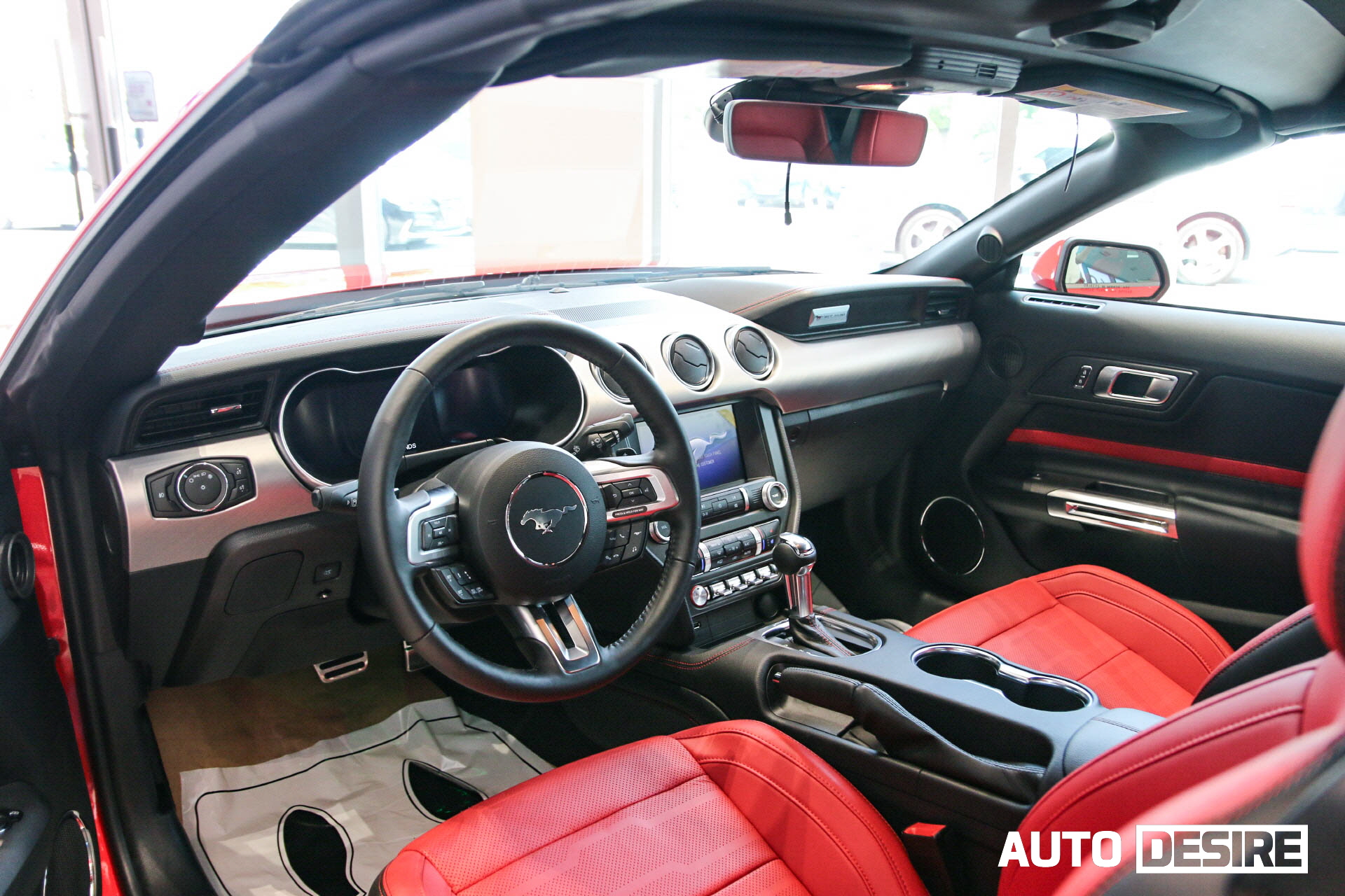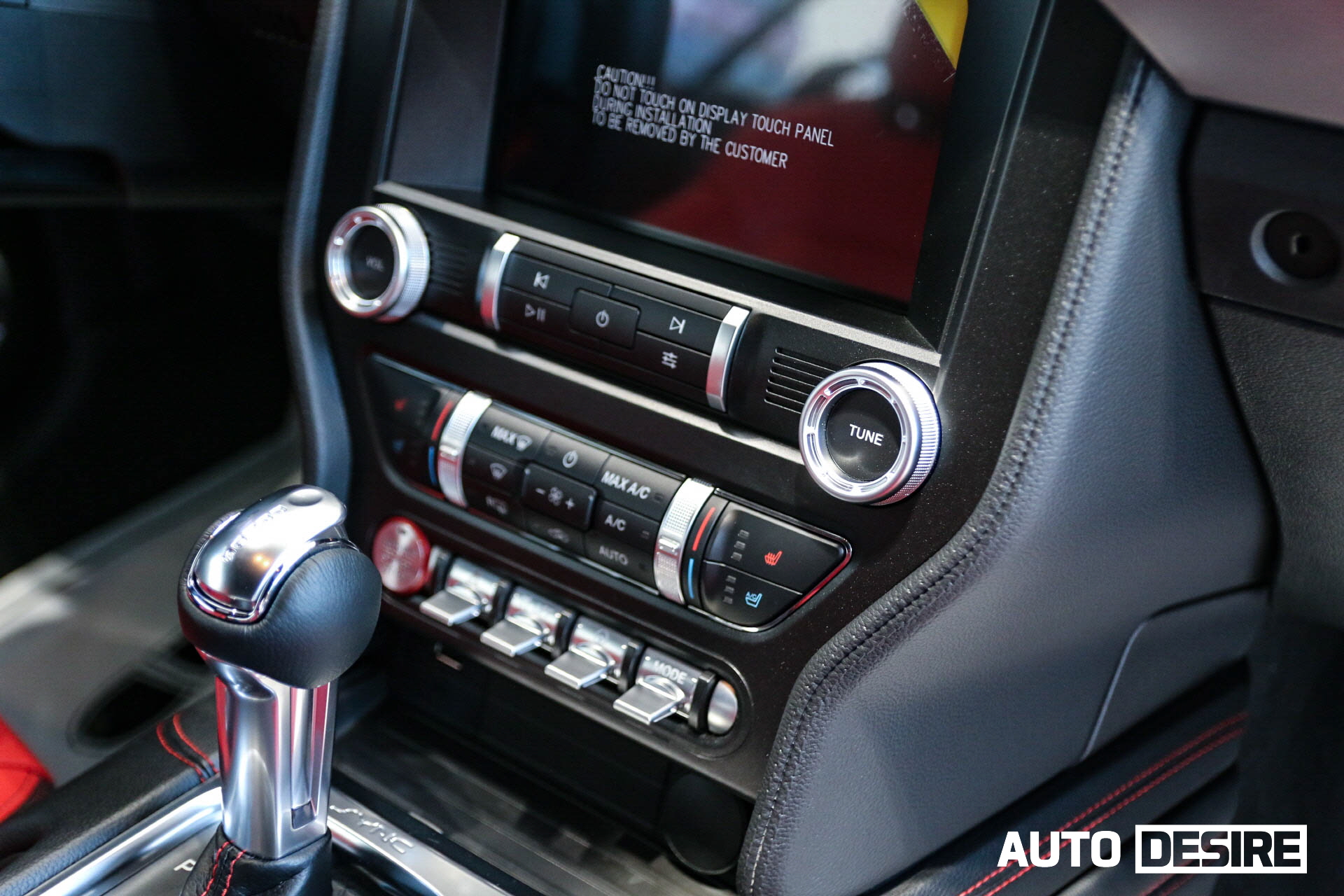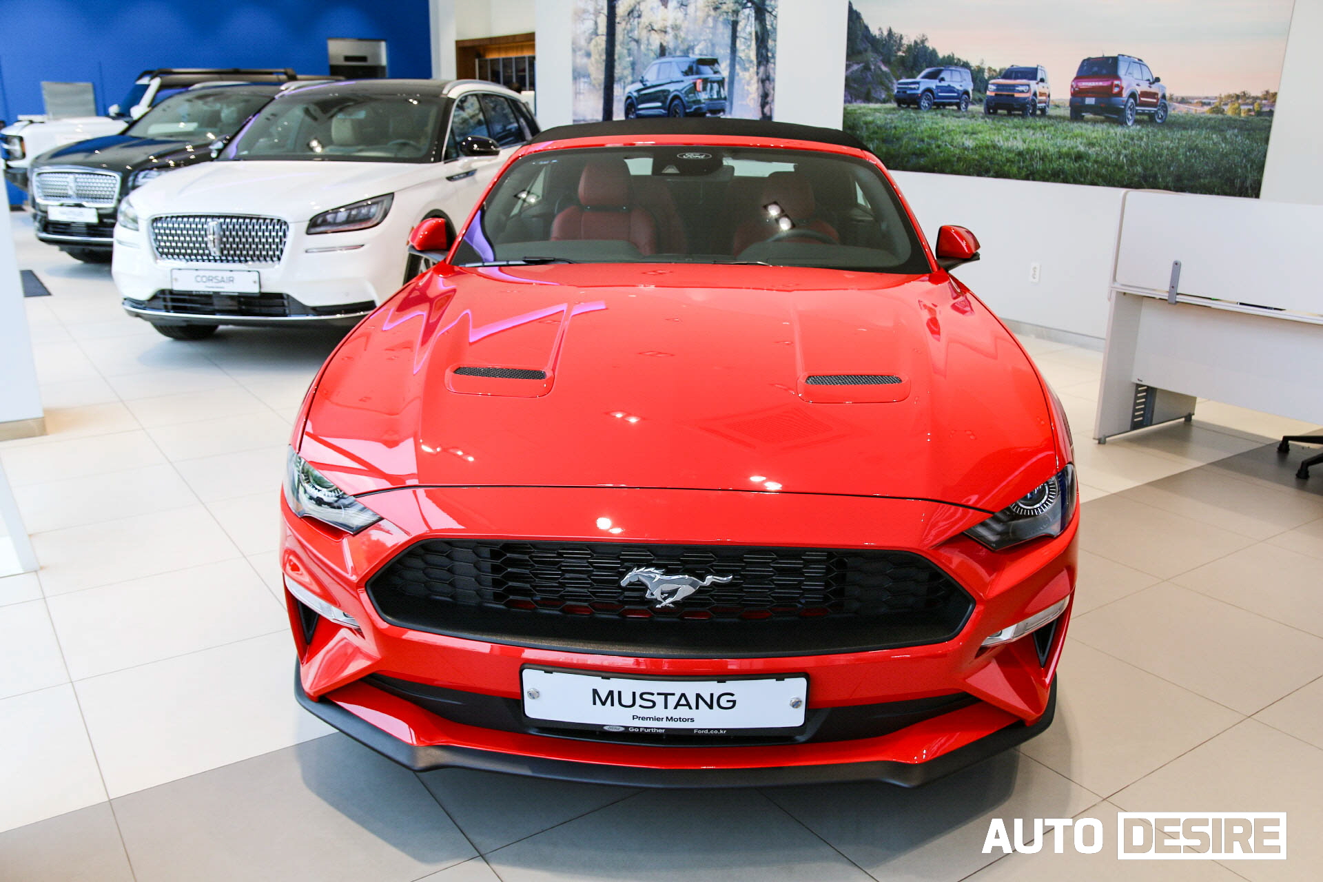 전시차는 레드 색상으로 스포츠카의 감성을 강렬하게 잘 느낄 수 있고, 에코부스트 모델의 트윈 7-스포크 휠은 블랙 컬러로 빨간 바디 색상과 조화를 이루면서 스포티한 감각을 더 강하게 끌어올려 준다. 먼저 살펴본 브롱코보다 더 오랜 헤리티지를 가진 머스탱 역시 기본 포드 엠블럼이 아닌 질주하는 야생마 엠블럼을 전면 그릴과 휠캡에도 적용했다.