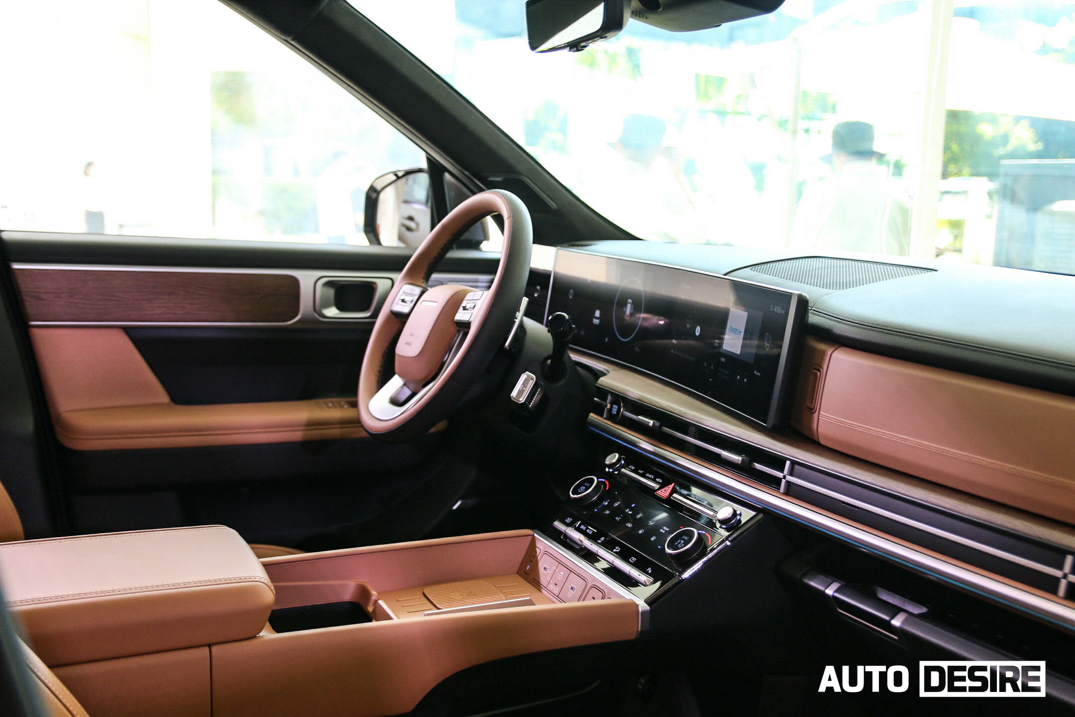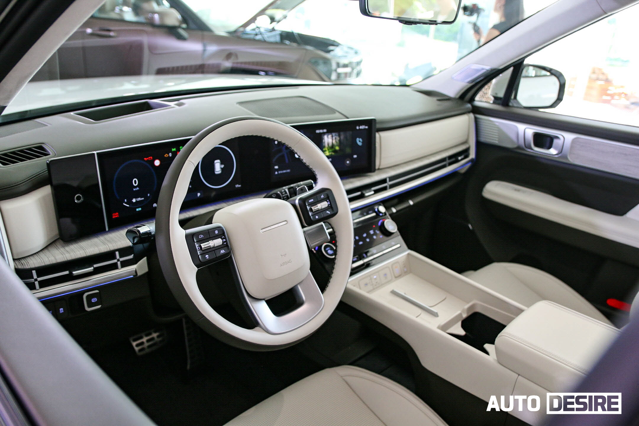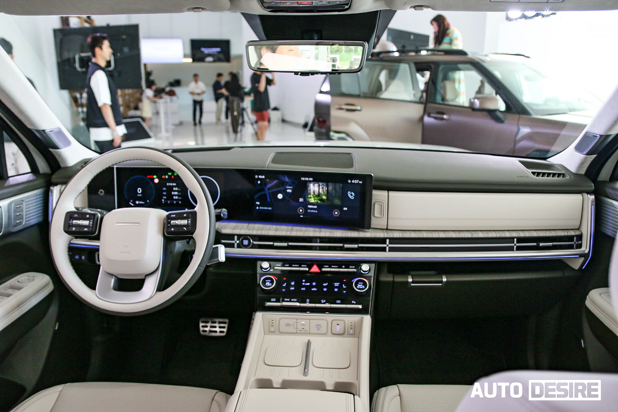 실내로 들어와 1열 공간은 넓은 개방감을 주는 수평형 레이아웃을 적용, 12.3인치 디지털 클러스터와 12.3인치 내비게이션 화면이 하나로 이어지는 파노라믹 커브드 디스플레이, H 디자인이 적용된 앰비언트 무드 라이트와 송풍구, 6.6인치 컬러 공조 디스플레이로 깔끔한 구성을 이루고 있으며, 큰 틀은 디 올 뉴 그랜저, 디 올 뉴 코나, 쏘나타 디 엣지 등과 공유하는 모습이다.