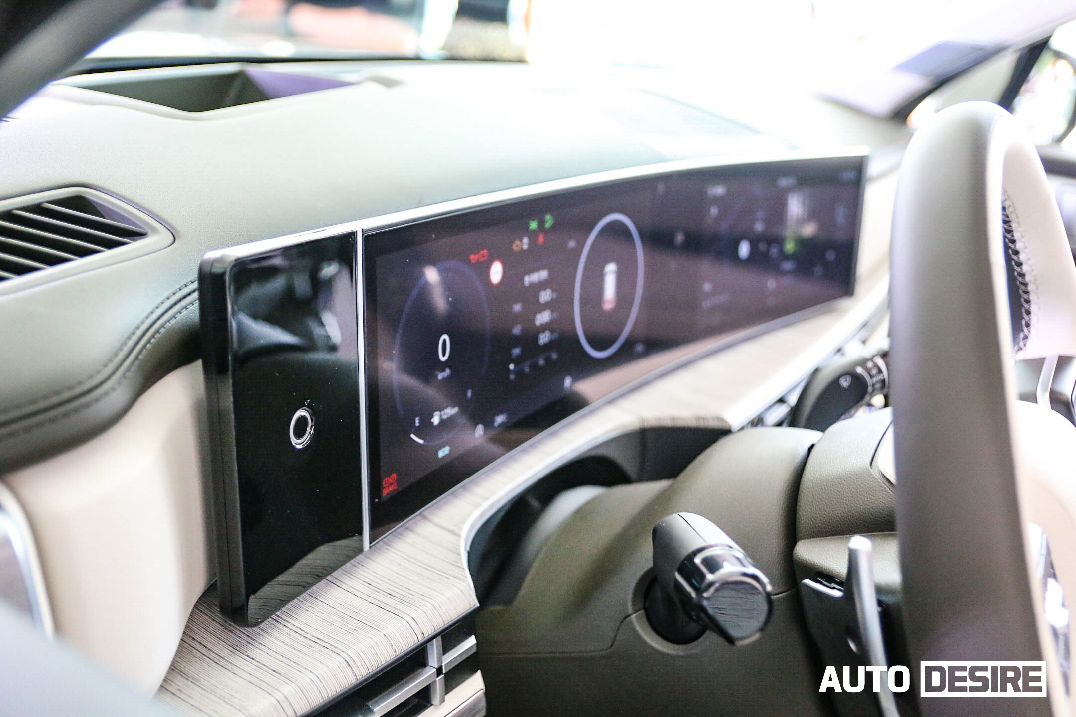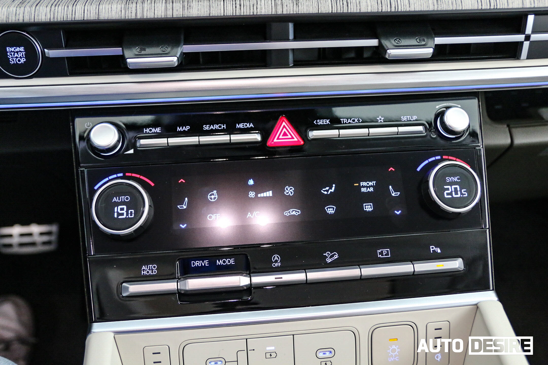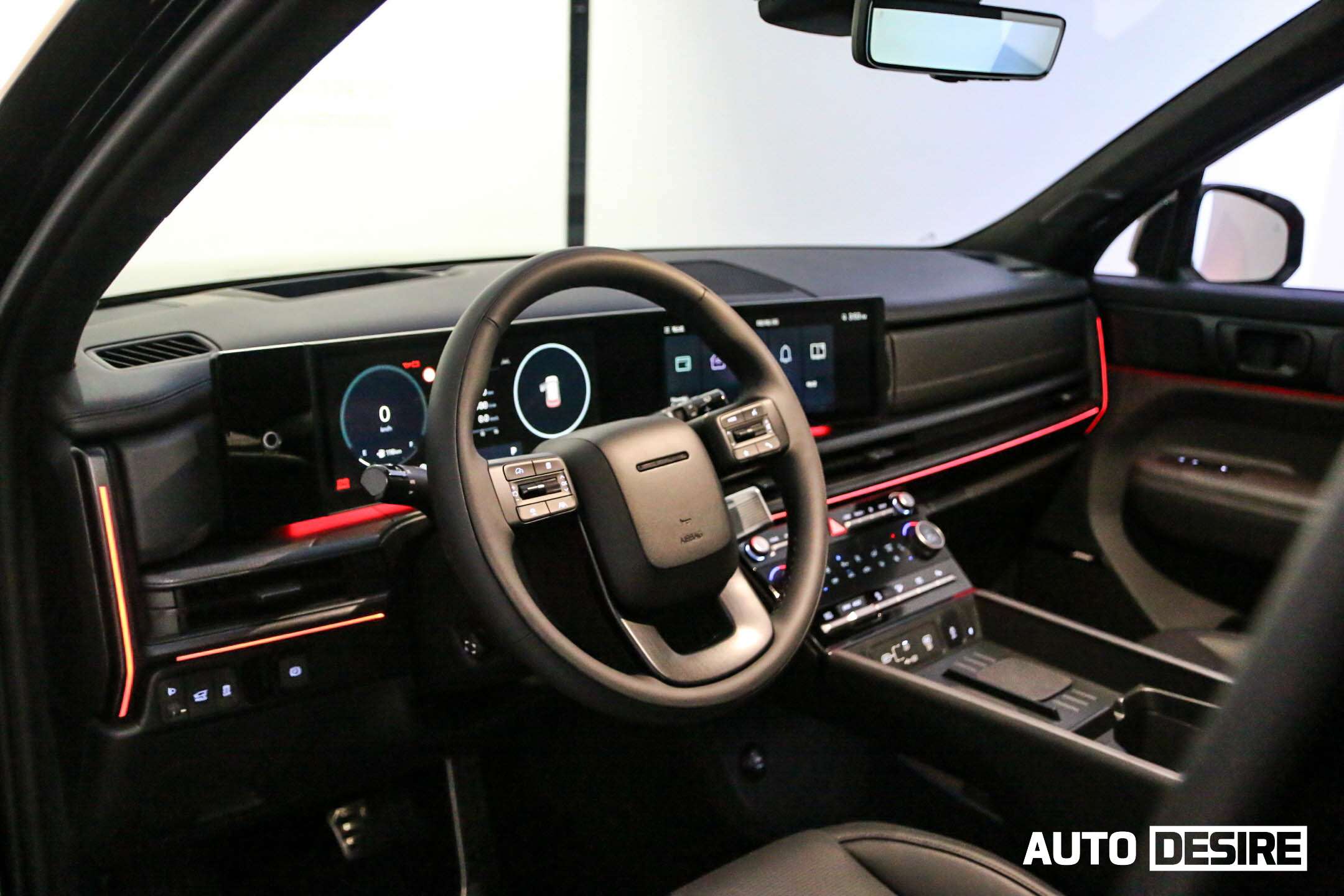 실내로 들어와 1열 공간은 넓은 개방감을 주는 수평형 레이아웃을 적용, 12.3인치 디지털 클러스터와 12.3인치 내비게이션 화면이 하나로 이어지는 파노라믹 커브드 디스플레이, H 디자인이 적용된 앰비언트 무드 라이트와 송풍구, 6.6인치 컬러 공조 디스플레이로 깔끔한 구성을 이루고 있으며, 큰 틀은 디 올 뉴 그랜저, 디 올 뉴 코나, 쏘나타 디 엣지 등과 공유하는 모습이다.