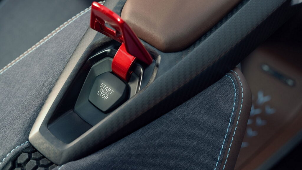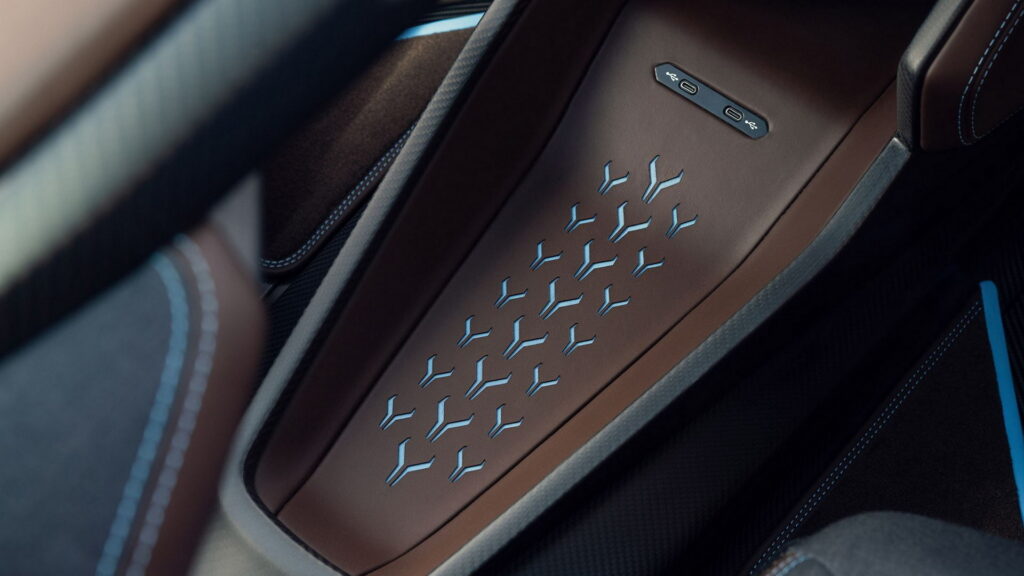 전기차 콘셉트 모델임에도 미사일 발사 버튼처럼 커버가 달린 시동 버튼을 가지고 있고, 실내 주요 소재는 카본 섬유와 함께 블루, 민트 색상의 스티치가 더해진 브라운 톤의 가죽과 그레이 톤의 고급 직물 소재가 혼용된 것으로 확인된다.