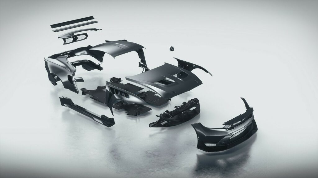 외장 디자인은 단순히 시각적으로 공격적이고 스포티한 감성을 만드는 것 외에, 공기역학적 성능을 최대한으로 끌어올리는데 중점을 두었으며, 프런트 범퍼의 스플리터와 측면 사이드 스커트, 후방 리어 디퓨저와 C 필러에 장착한 커다란 사이즈의 리어 윙, 펜더와 후드, 트렁크 리드까지 모두 카본 섬유로 제작되어 차체 무게는 최대한으로 줄이면서 강성은 높이고, 다운포스 성능까지 더 크게 끌어올렸다. 차량 전면부에는 유압 작동식 플랩도 적용되었다.
