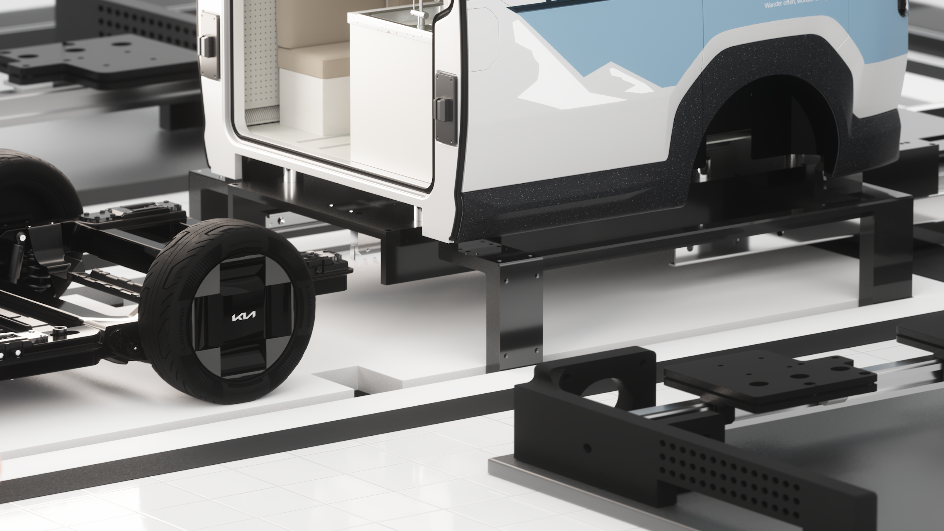PV5 샤시캡은 PV5가 가진 유연성과 범용성을 직관적으로 이해할 수 있게 해주며, 운전석을 제외한 후면의 모듈을 교체하는 '이지스왑' 기술을 통해서 1대의 차량을 각 상황별 필요에 따라 사무실, 작업실, 창고 등으로 기능을 유연하게 바꿀 수 있는 모습을 제시한다.