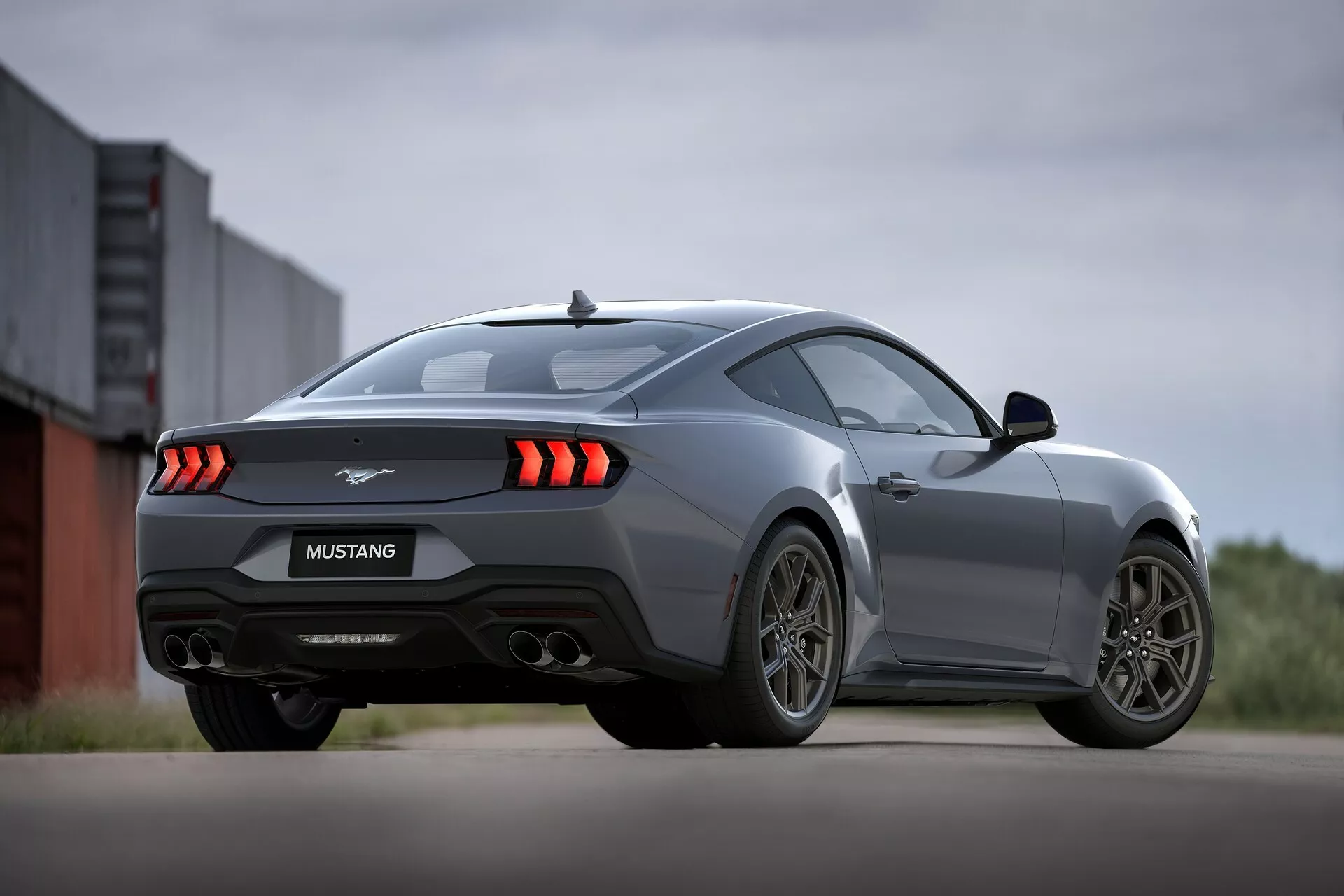 후면에서도 이전 세대 모델 대비 더 날렵하고 말끔한 라인을 보여주면서 리어 펜더와 트렁크 리드의 각을 더 날카롭게 다듬었다. 머스탱의 시그니처 디자인인 3분할 램프를 리어 램프에도 동일하게 유지되었고, 2.3 에코부스트 모델은 듀얼 머플러 팁과 머스탱 야생마 엠블럼을, 5.0 GT 모델에는 쿼드 머플러 팁과 GT 전용 엠블럼을 적용해 디자인 차별화를 두었다.