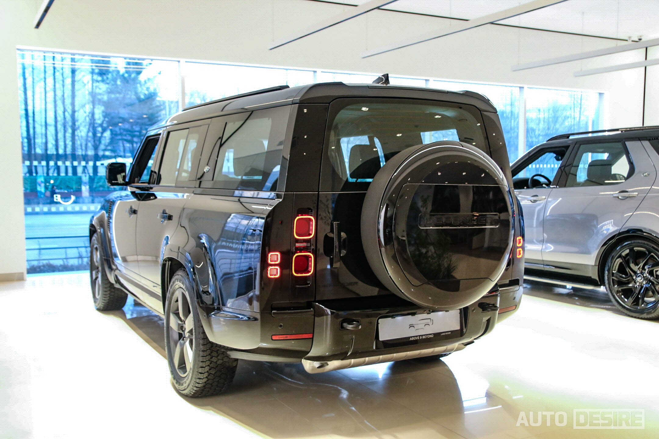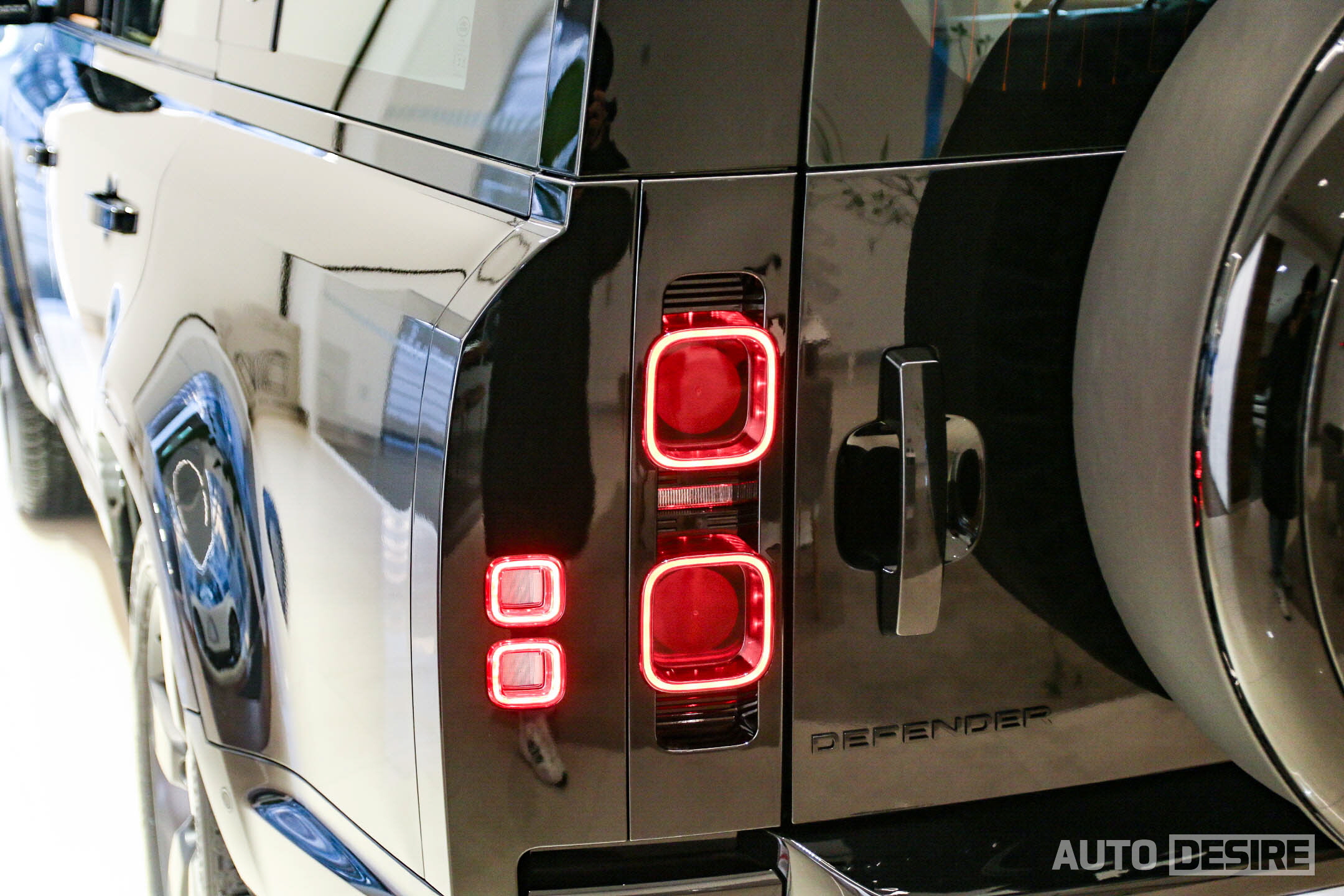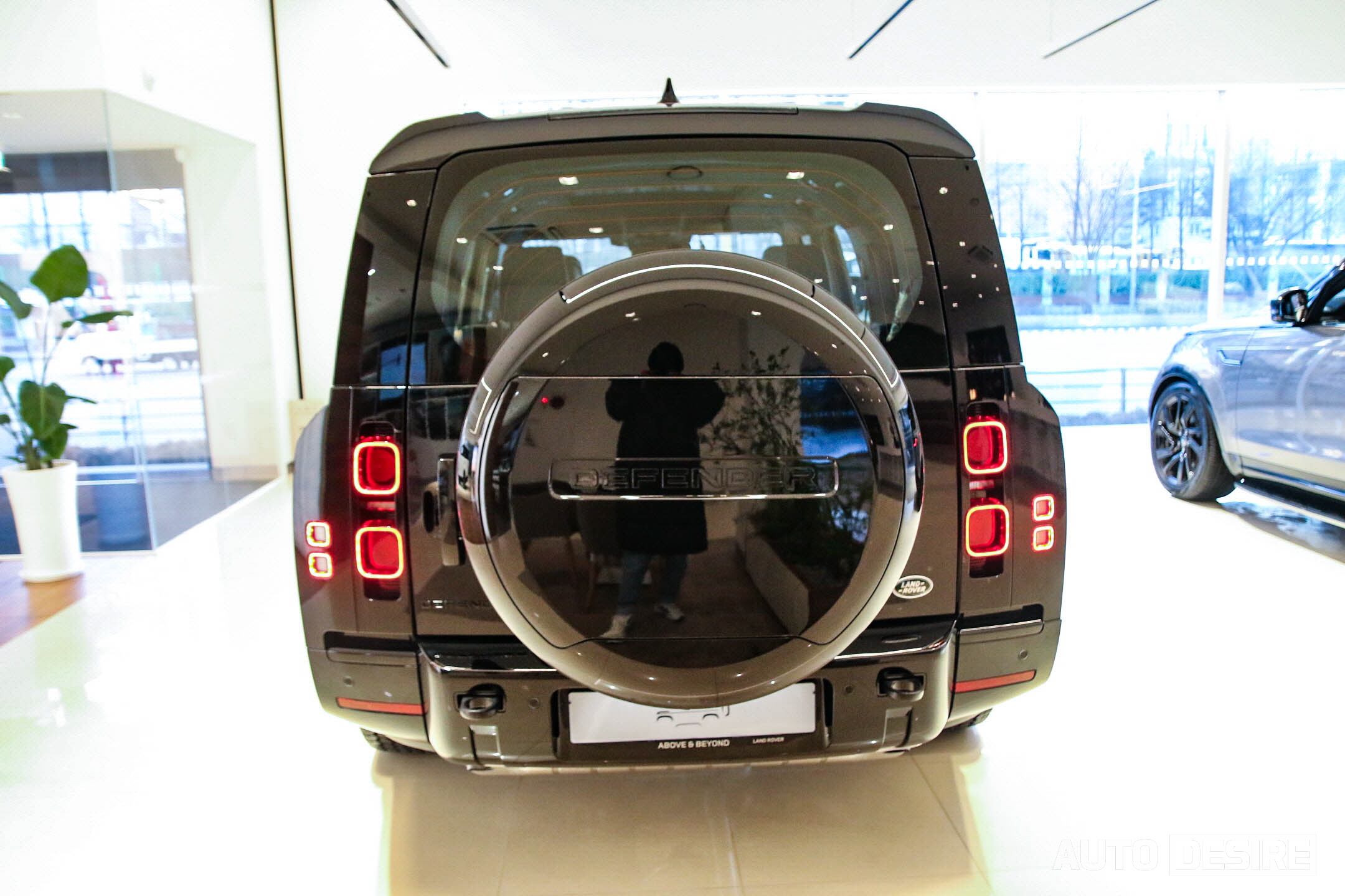 차체 후면에서도 다른 디펜더 라인업과 동일하게 여러 개의 사각형으로 조합된 LED 리어 콤비네이션 램프가 적용되고, 확장 블랙 익스테리어 팩 적용으로 스페어타이어 커버와 하단 스키드 팬, 견인 고리 부분까지 모두 유광 블랙 액센트로 마감된 모습이다.