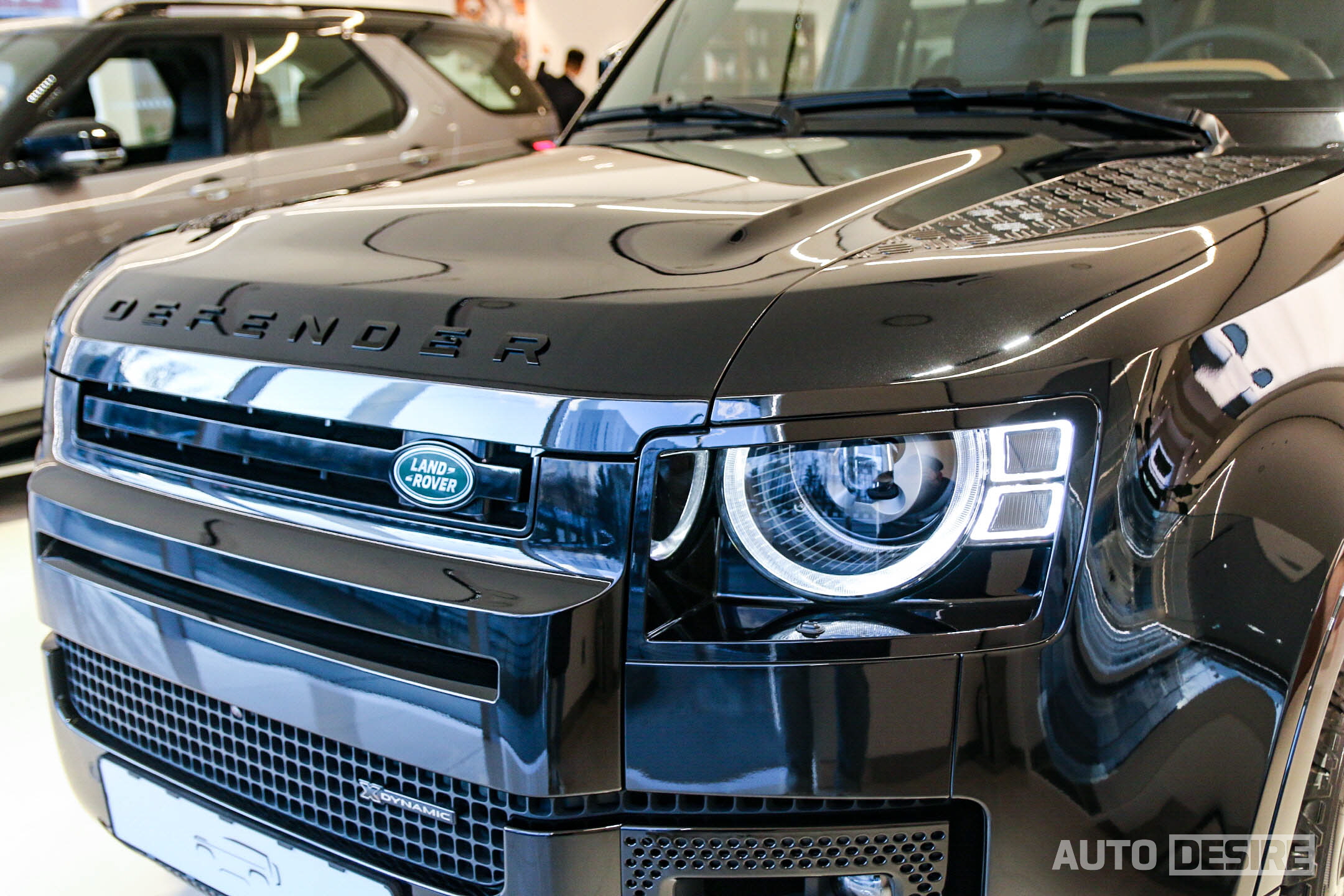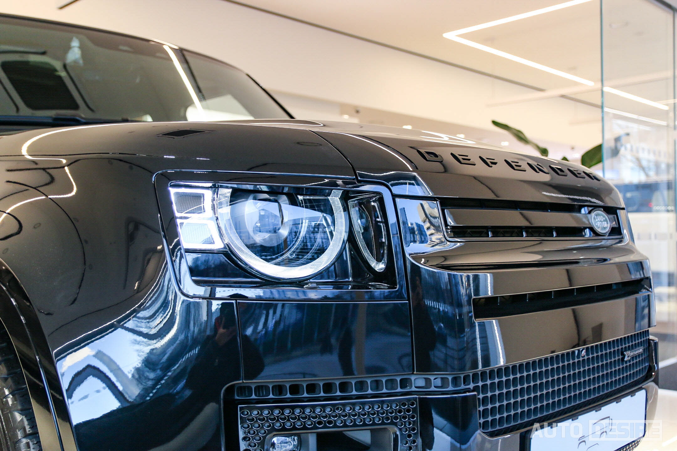 전면부에서는 오리지널 클래식 디펜더를 재해석해 단차 없이 매끄럽고 깔끔하게 다듬은 보닛-펜더 라인과 함께 튀어나온 오버 펜더 볼륨을 통해 터프하고 안정감 있는 자세를 전해주며, 수평형으로 깔끔한 프런트 라디에이터 그릴 디자인과 사각형의 각진 테두리 라인에 반원 형태의 LED 헤드램프와 시그니처 DRL이 적용되어 오프로더 SUV의 탄탄하고 강인한 인상을 모던하고 세련되게 잘 다듬었다.