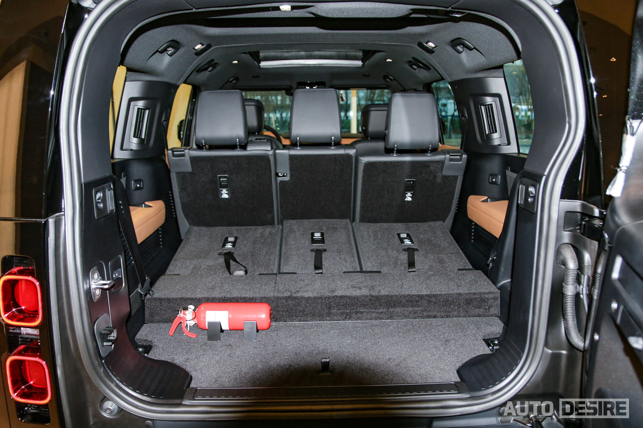전폭은 1,966mm, 전고는 1,970mm, 휠베이스는 3,022mm로 디펜더 110과 동일하거나 미미한 수준의 차이가 있을 뿐이지만 리어 오버행이 연장되면서 340mm 더 길어진 5,098mm의 상당히 긴 전장을 가지게 되었다. 휠베이스가 늘어난 것이 아니기 때문에 2열의 레그룸에는 큰 영향은 없지만, 뒤쪽 공간이 길어지면서 추가로 3열 공간을 의미 있게 가져갈 수 있었고, 시트 폴딩 시 적재 공간도 더 여유롭게 확장할 수 있는 장점을 갖췄다.