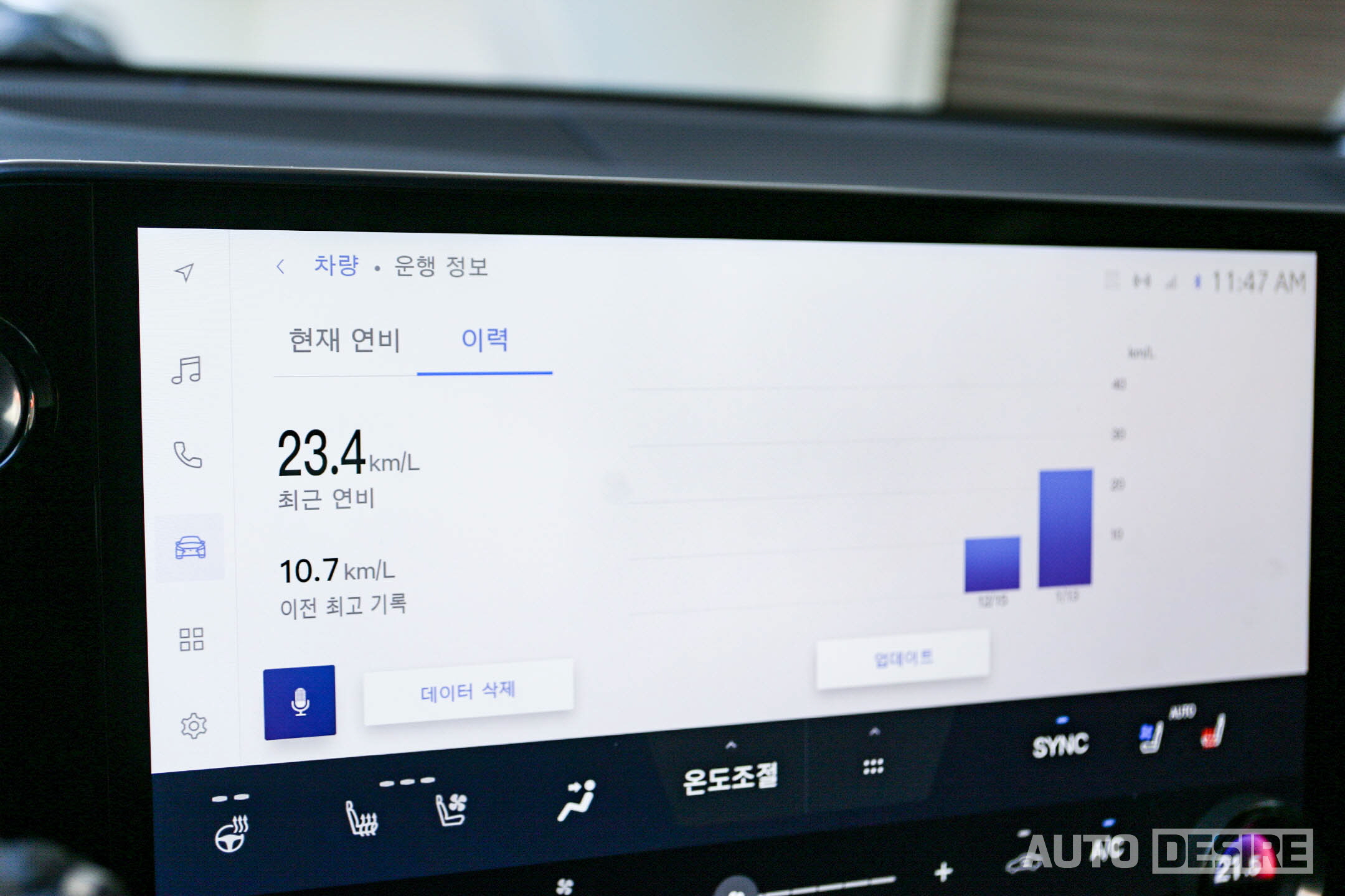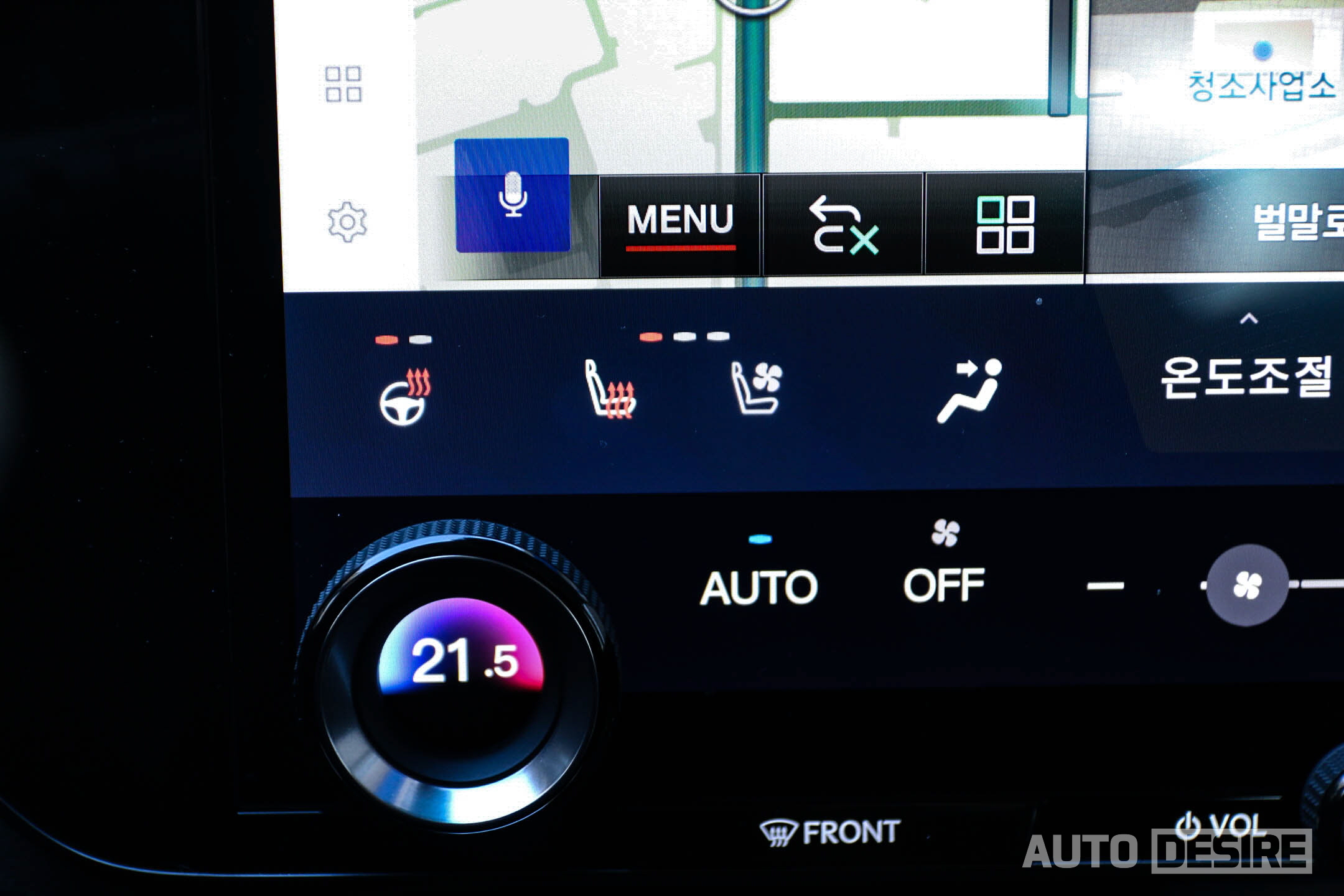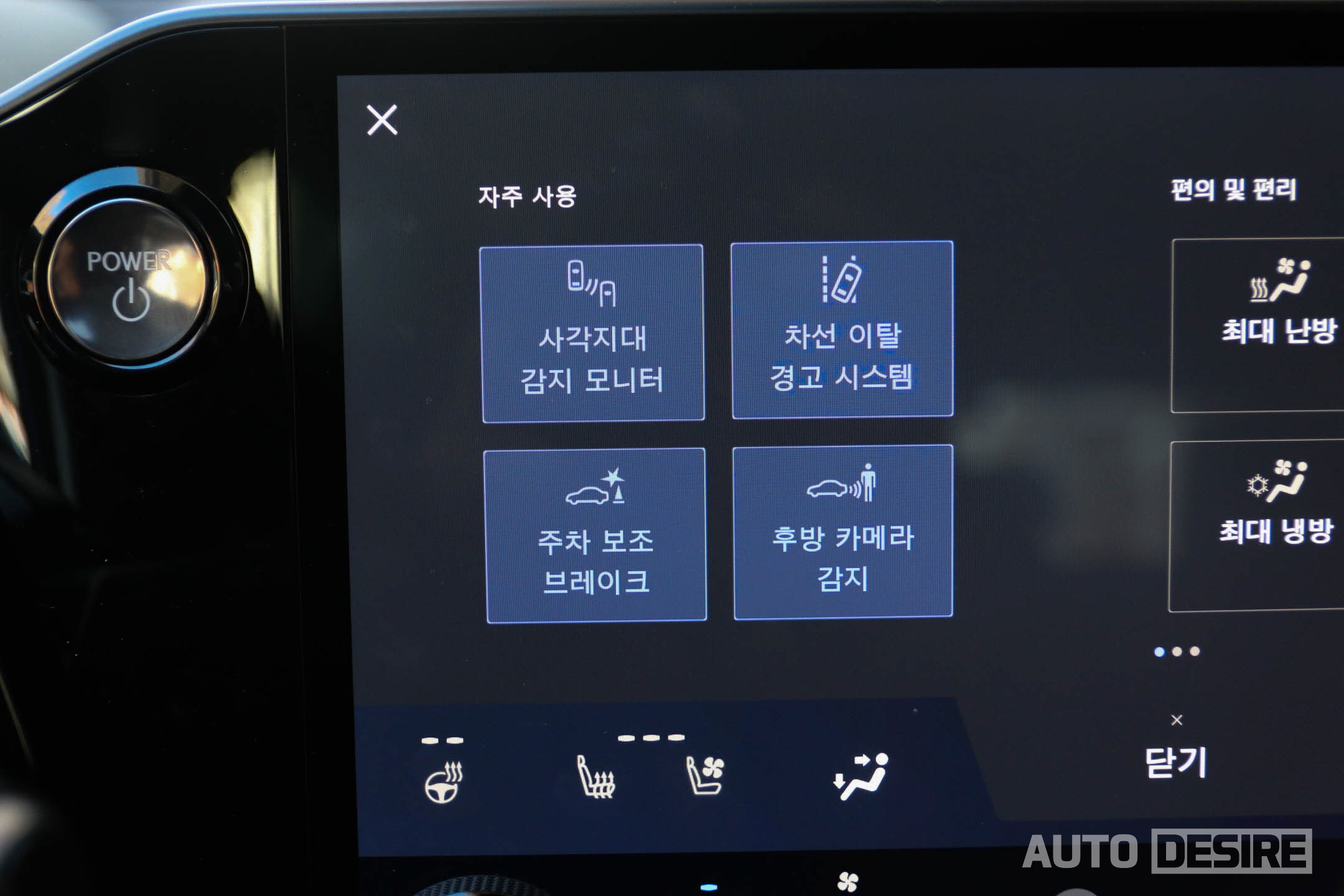 공조 컨트롤을 터치 디스플레이 하단에 별도 화면과 다이얼을 배치해서 시트 열선, 통풍, 스티어링 휠 열선도 빠르게 조절할 수 있고 AUTO 모드로 설정 온도, 외부 온도에 맞춰서 자동으로도 작동할 수 있다.
