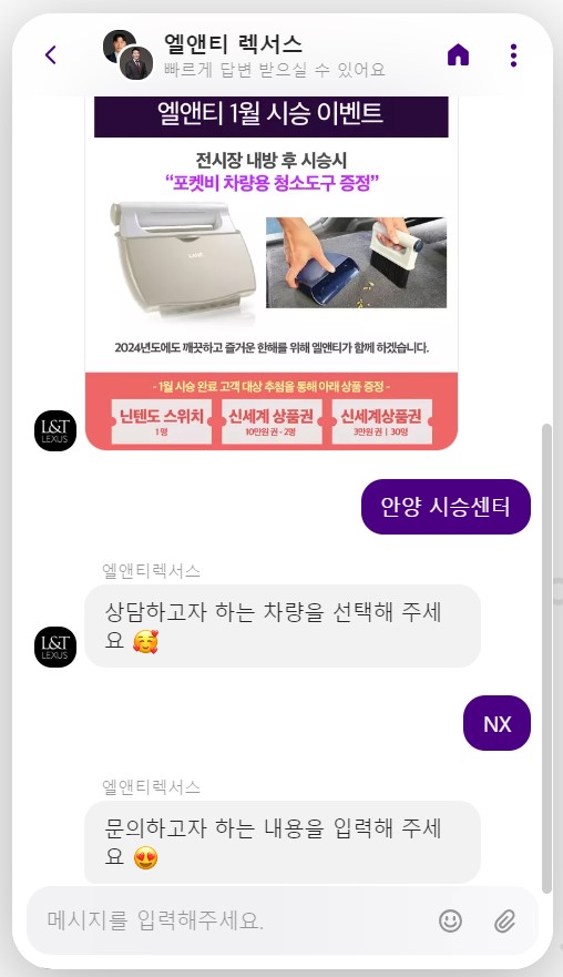 하이브리드 SUV ‘렉서스 NX’를 비롯해, 다양한 렉서스 하이브리드 차량에 대해 관심이 있거나 구매 상담이 필요하다면, 전시장에 직접 방문해 세일즈 컨설턴트와 직접 대면하지 않아도 엘앤티 렉서스 채널톡 서비스를 통해 외관과 실내 컬러, 원하는 트림 등급까지 구매를 원하는 차량의 재고도 빠르게 확인 가능하니, 궁금한 부분은 엘앤티렉서스 채널톡 상담으로, 시승은 비대면 스마트 드라이브로 이용해 보기를 추천한다.